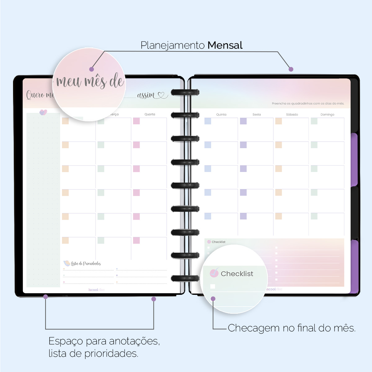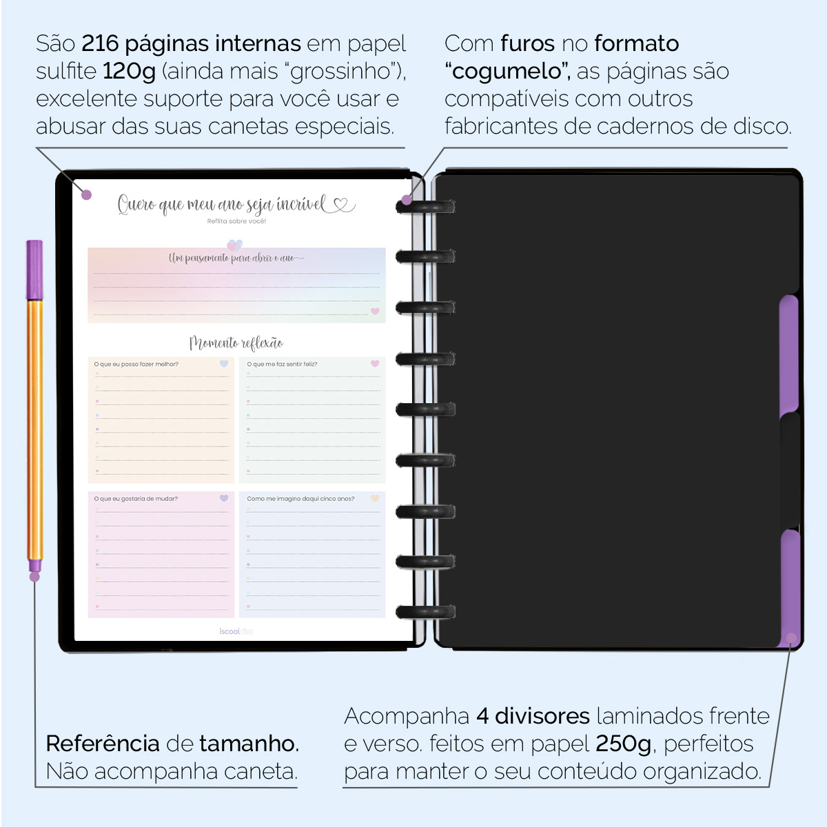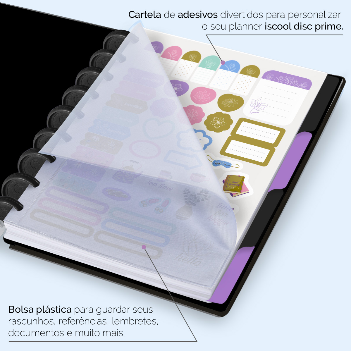 Além de tudo isso, o ISCOOL DISC Planner Permanente conta com detalhes que fazem toda a diferença: elástico para fechamento da capa, proporcionando muito mais estilo e privacidade para suas anotações; bolsa plástica para guardar seus rascunhos, referências, lembretes e documentos; e uma cartela de adesivos incríveis para que você possa personalizar o planner do seu jeitinho!