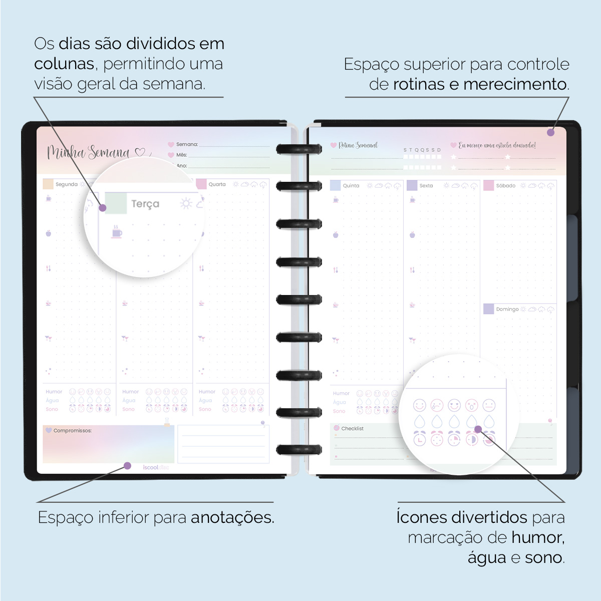 Os dias são divididos em colunas, permitindo uma visão geral da semana, onde você mesmo irá indicar o dia, a semana, o mês e o ano. Assim, você pode utilizar o seu planner independentemente do ano em que estivermos. Não é incrível?