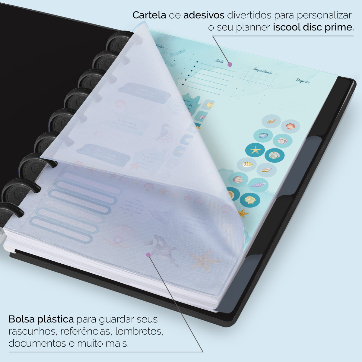 Além de tudo isso, o ISCOOL DISC Planner Permanente conta com detalhes que fazem toda a diferença: elástico para fechamento da capa, proporcionando muito mais estilo e privacidade para suas anotações; bolsa plástica para guardar seus rascunhos, referências, lembretes e documentos; e uma cartela de adesivos incríveis para que você possa personalizar o planner do seu jeitinho!