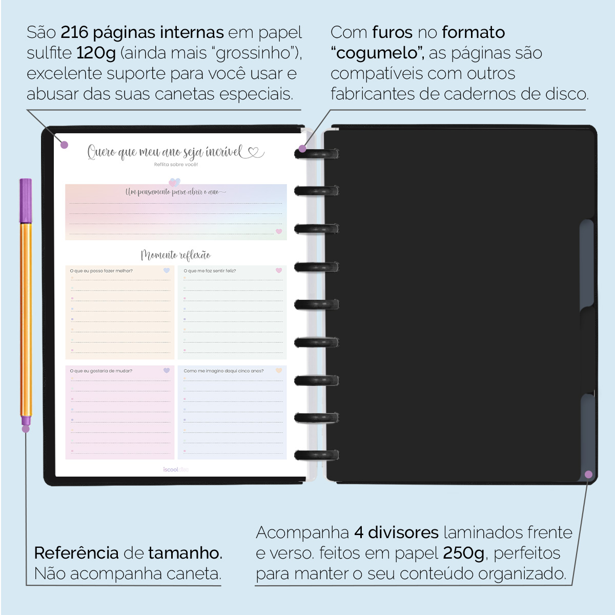O miolo conta com páginas decoradas em papel sulfite 120g (aquele papel ainda mais "grossinho"), para que você use e abuse das suas canetas especiais. Com furos no formato de "cogumelo", você poderá dar um "up" nele com nossos refis, além de ser compatível com outros fabricantes de cadernos e planners de discos.