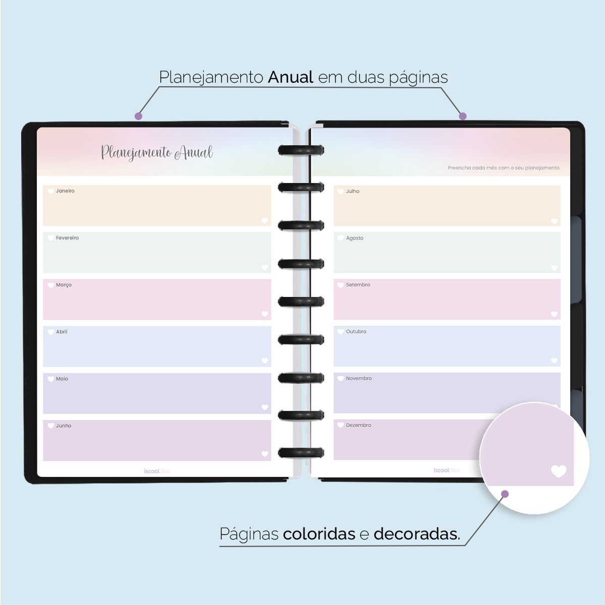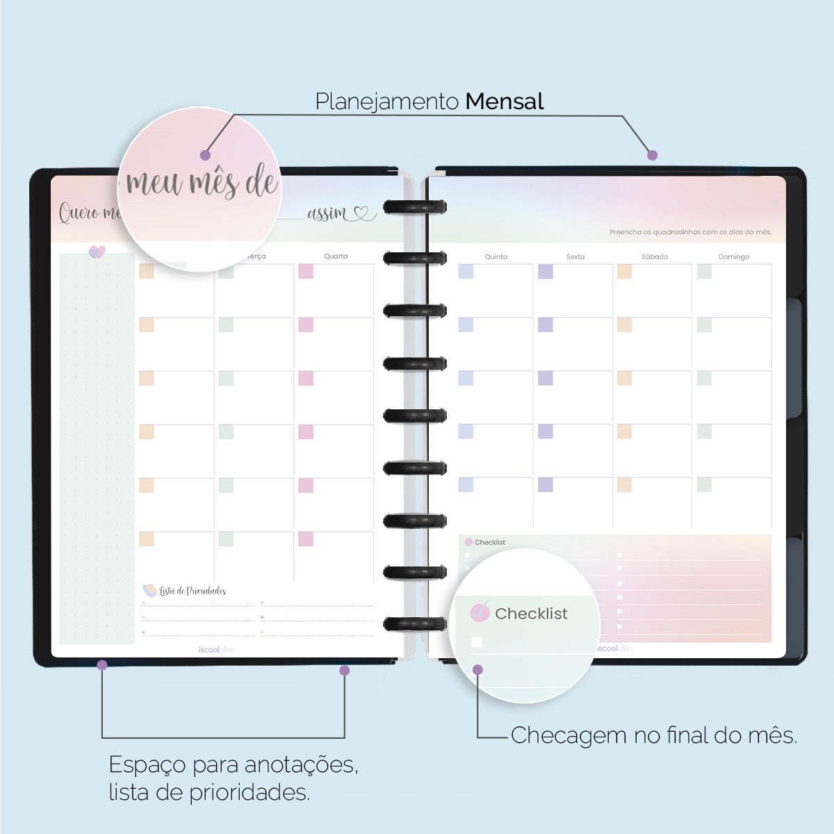 O ISCOOL DISC Planner Permanente foi criado especialmente para ajudar você a alcançar todas as suas metas e objetivos pessoais. É um planner totalmente customizável, no qual os elementos são reposicionáveis. Você pode montá-lo como preferir, deixando sua criatividade fluir livremente.