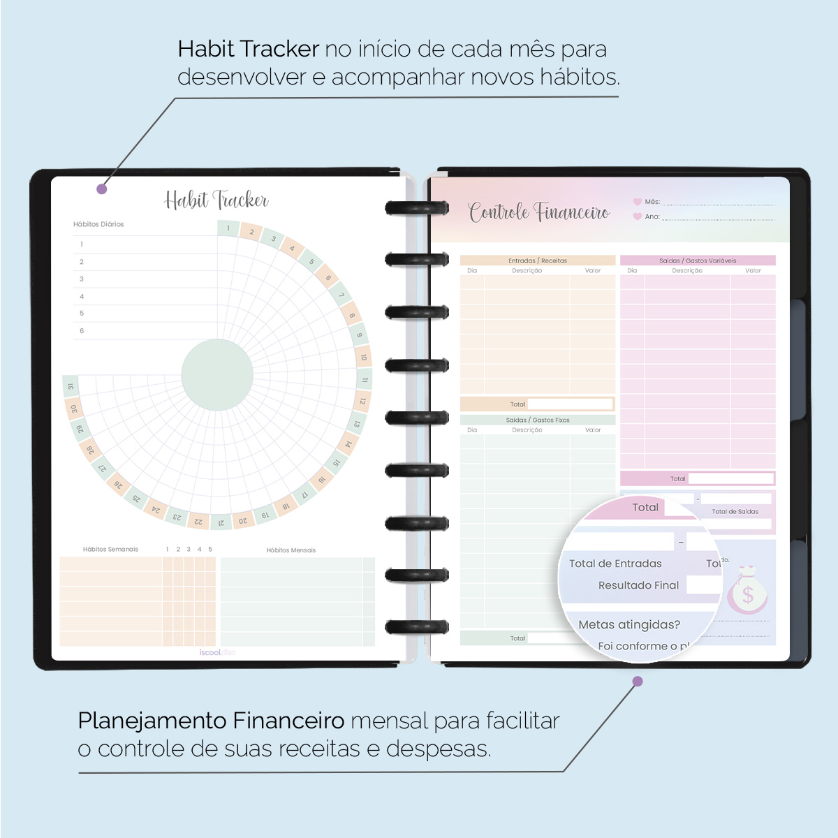 No início de cada mês, há um planejamento mensal, facilitando visualmente as suas principais anotações, um "Habit Tracker" para você desenvolver novos hábitos ou controlar os mais importantes, e ainda um planejamento financeiro, facilitando o controle das suas receitas e despesas, além de inúmeras outras funcionalidades.
