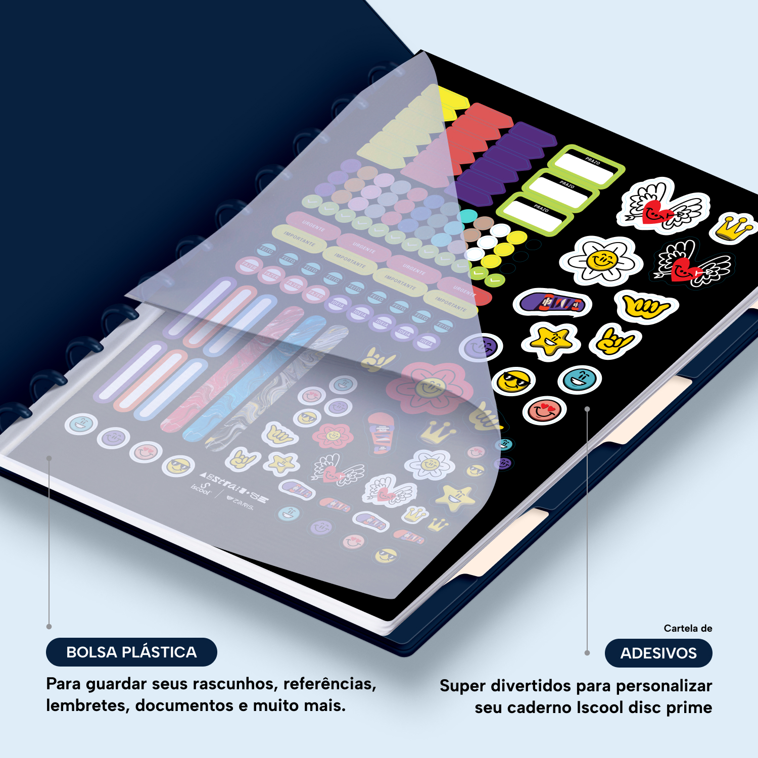 Além de tudo isso, o iscooldisc Prime conta com detalhes que fazem toda a diferença: elástico para fechamento da capa, muito mais estilo e privacidade para suas anotações; bolsa plástica para guardar seus rascunhos, referências, lembretes, documentos e uma cartela de adesivos incríveis, para que você possa personalizar seu caderno do seu jeitinho!