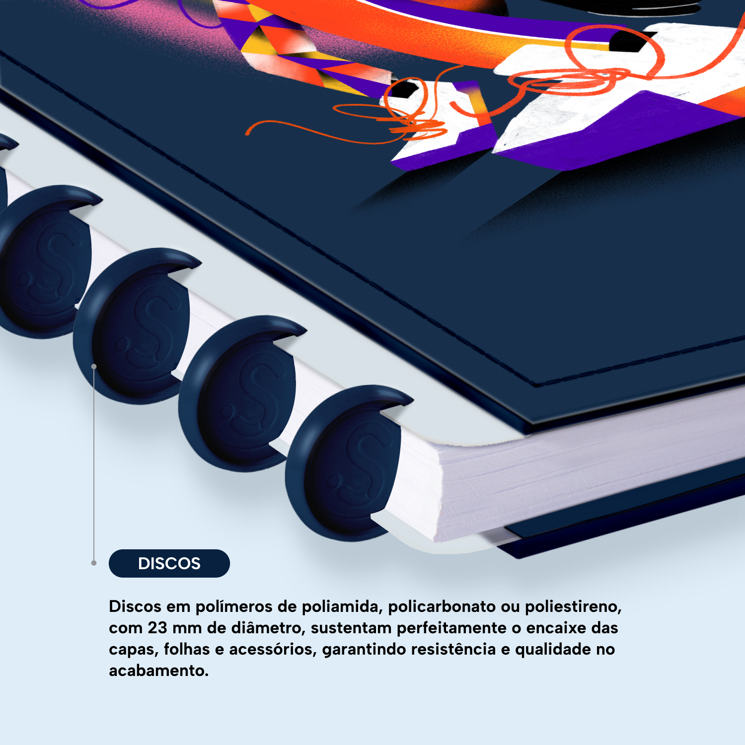 Encadernado com 11 discos M de 23mm em polímero de nylon e/ou policarbonato coloridos, fabricados no Brasil.