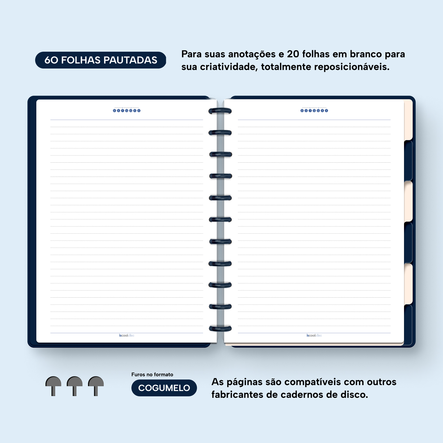 O miolo conta com 60 folhas pautadas decoradas em papel sulfite 90g (aquele papel mais “grossinho”) para que você use e abuse das suas canetas especiais, e 20 folhas em branco, ideais para explorar seu lado mais criativo ou até imprimir nelas.