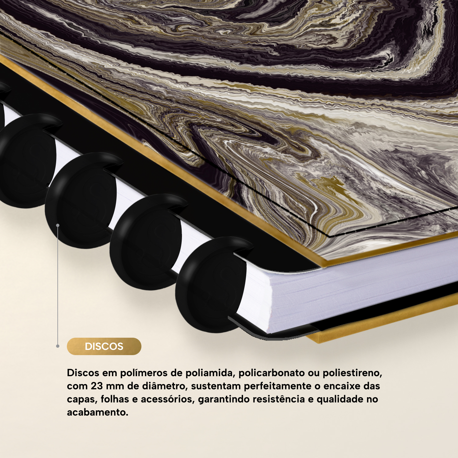 Os nossos discos são fabricados em polímero de nylon e/ou policarbonato. Podem ser substituídos, proporcionando imensa variedade na combinação das cores, qualidade no acabamento e eficácia no encaixe das capas, folhas e acessórios.