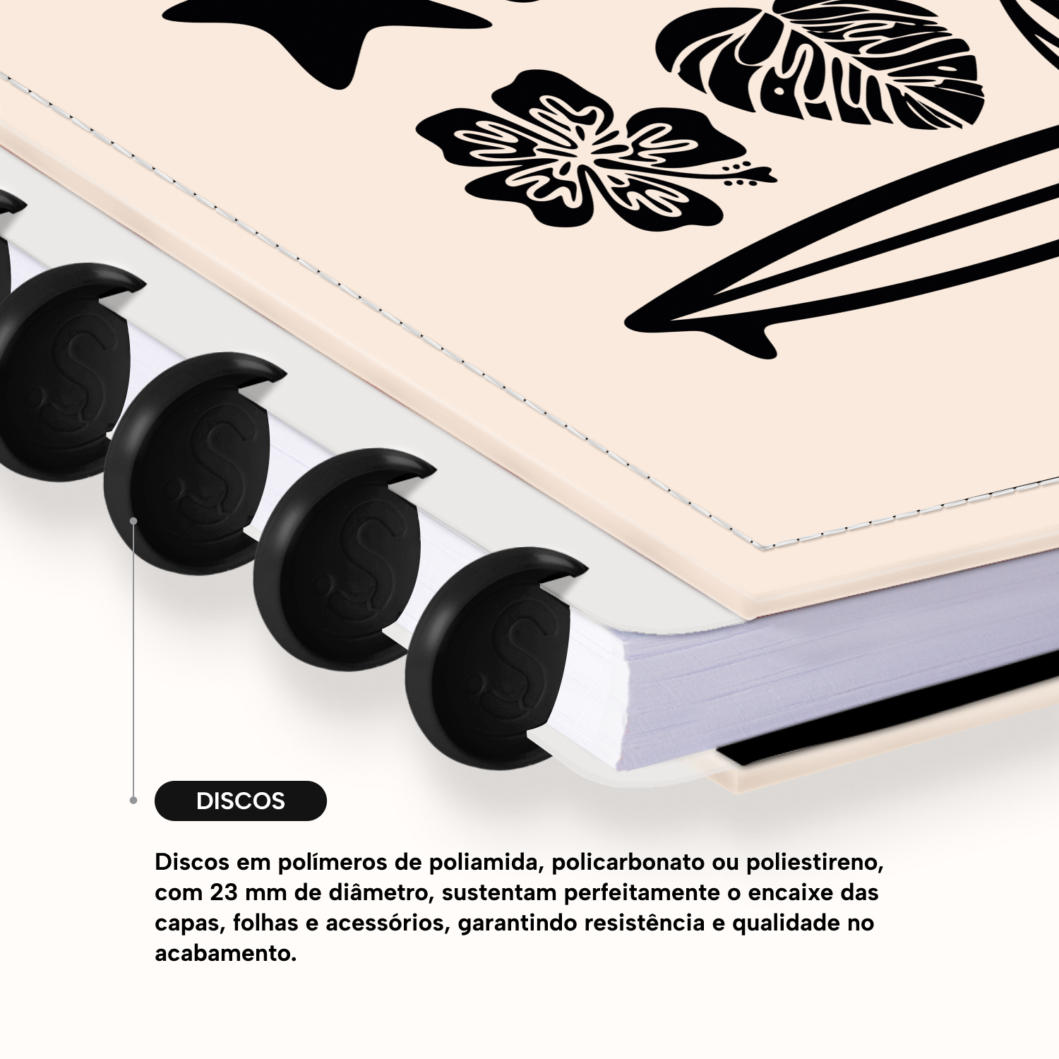 • Encadernado com 5 discos M de 23 mm em polímero de nylon e/ou policarbonato colorido, fabricados no Brasil.