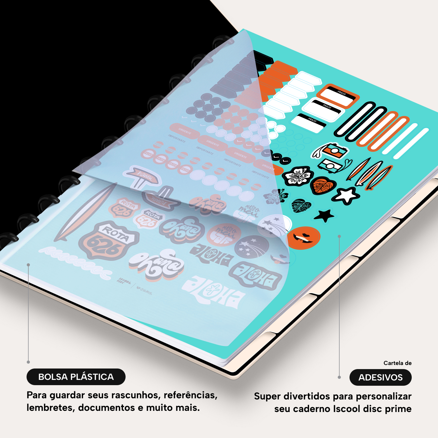 Além de tudo isso, o ISCOOL DISC PRIME conta com detalhezinhos que fazem toda a diferença: elástico para fechamento da capa — muito mais estilo e privacidade para suas anotações —, bolsa plástica para guardar seus rascunhos, referências, lembretes, documentos e uma cartela de adesivos incríveis para que você possa personalizar seu caderno do seu jeitinho!