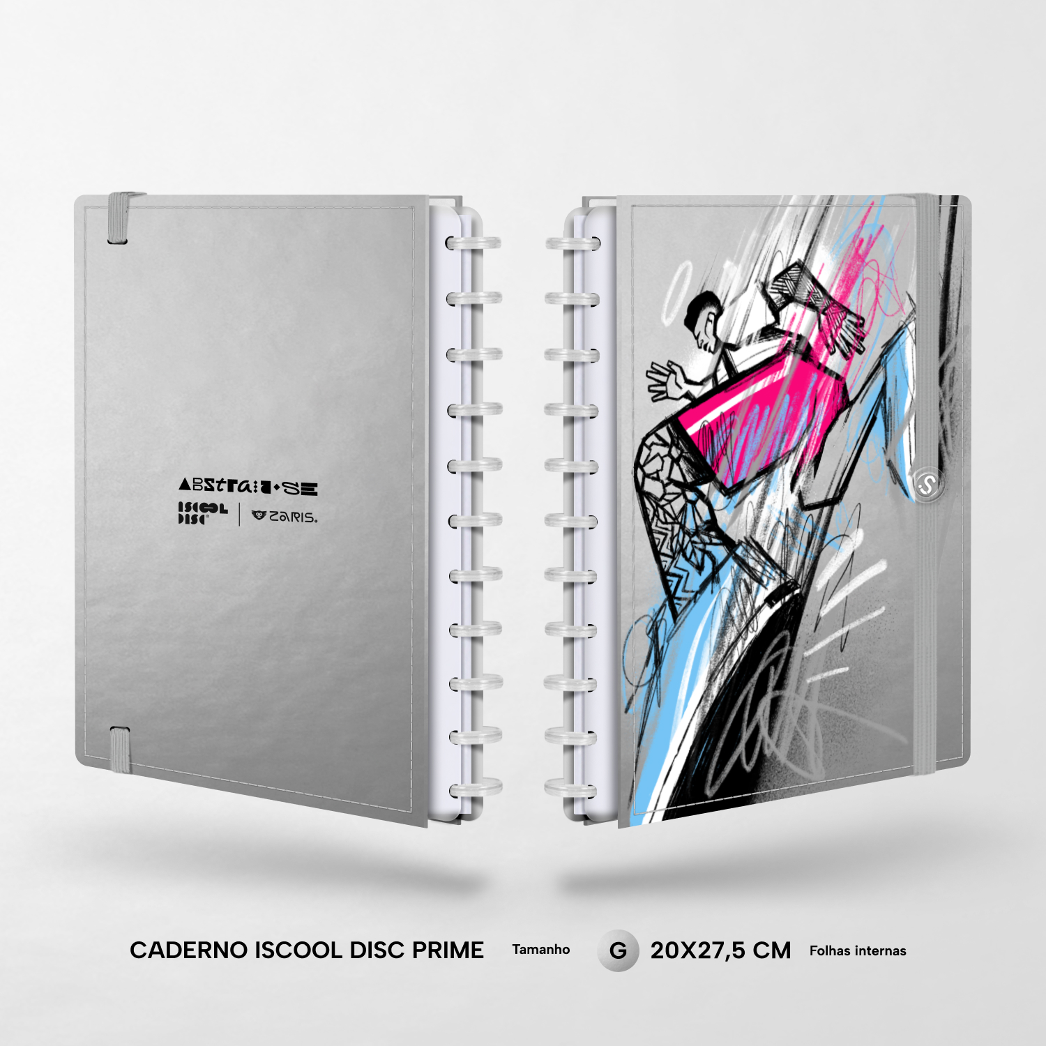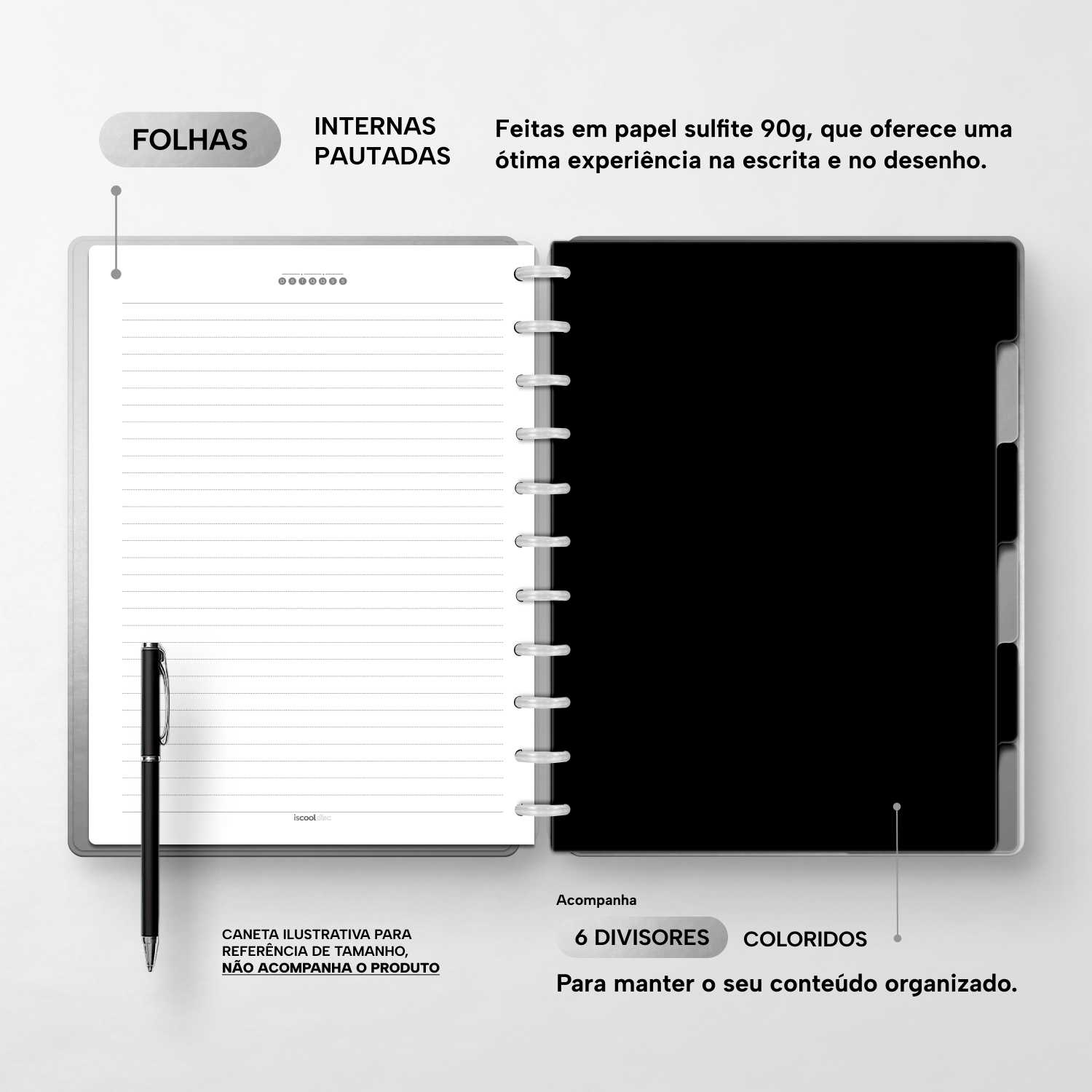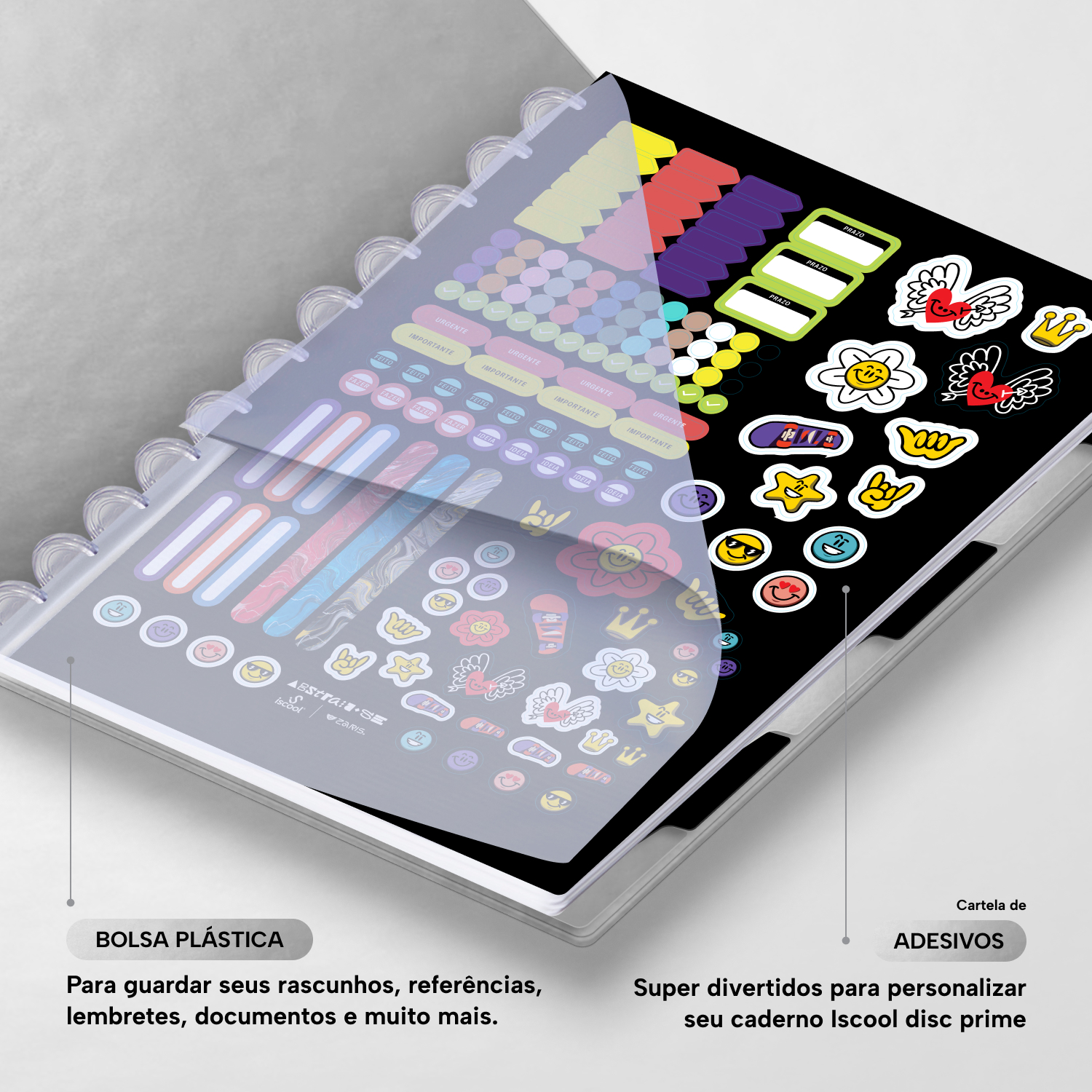 Além de tudo isso, o iscooldisc Prime conta com detalhes que fazem toda a diferença: elástico para fechamento da capa, muito mais estilo e privacidade para suas anotações; bolsa plástica para guardar seus rascunhos, referências, lembretes, documentos e uma cartela de adesivos incríveis, para que você possa personalizar seu caderno do seu jeitinho!