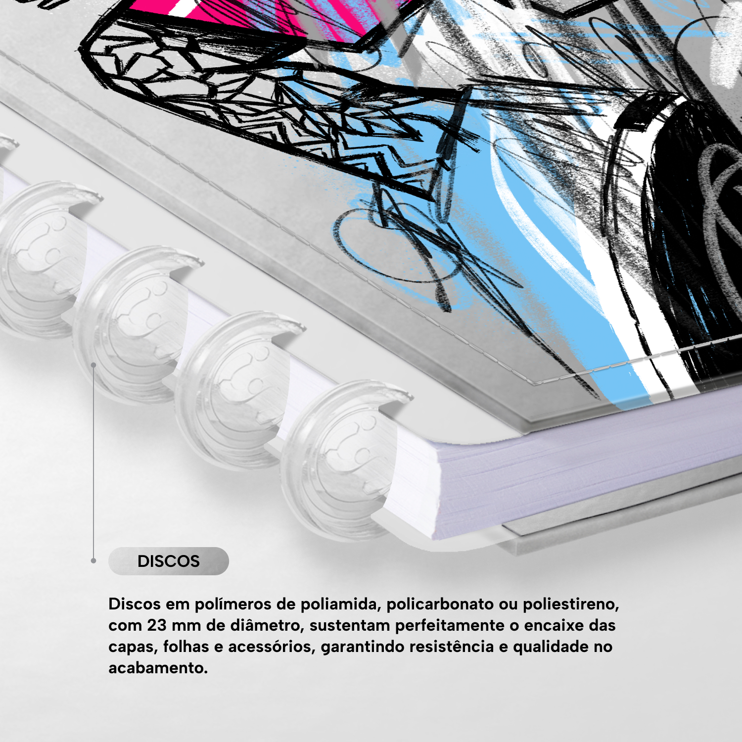 Os nossos discos são fabricados em polímero de nylon e/ou policarbonato. Podem ser substituídos, proporcionando imensa variedade na combinação das cores, qualidade no acabamento e eficácia no encaixe das capas, folhas e acessórios.