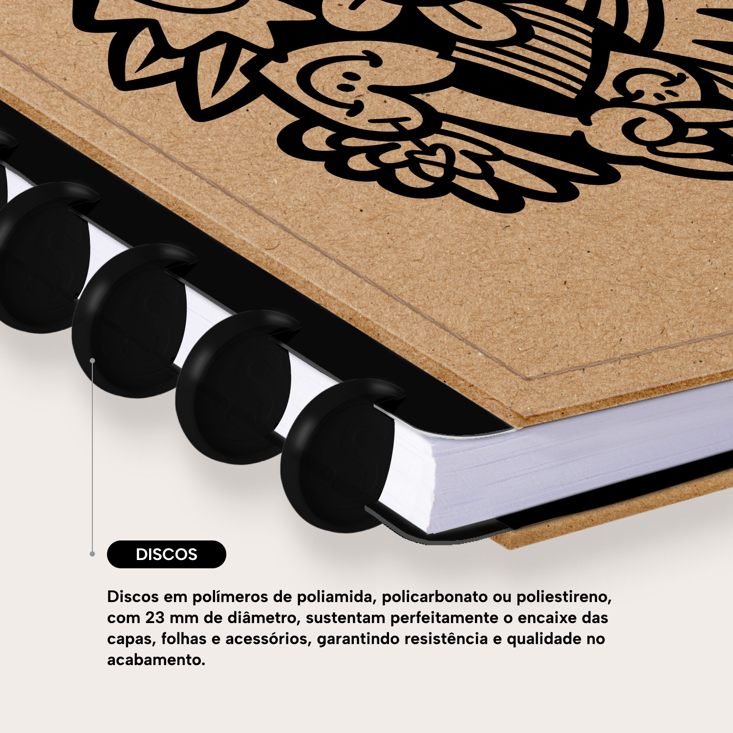 Os nossos discos são fabricados em polímero de nylon e/ou policarbonato. Podem ser substituídos, proporcionando imensa variedade na combinação das cores, qualidade no acabamento e eficácia no encaixe das capas, folhas e acessórios.