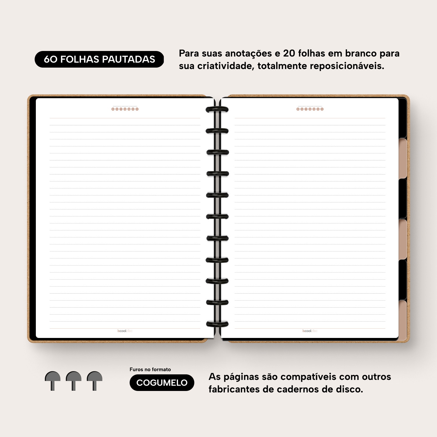 Com furos no formato de “cogumelo”, você poderá dar um “up” em seu caderno com nossos refis, além de ser compatível com outros fabricantes de cadernos de discos.