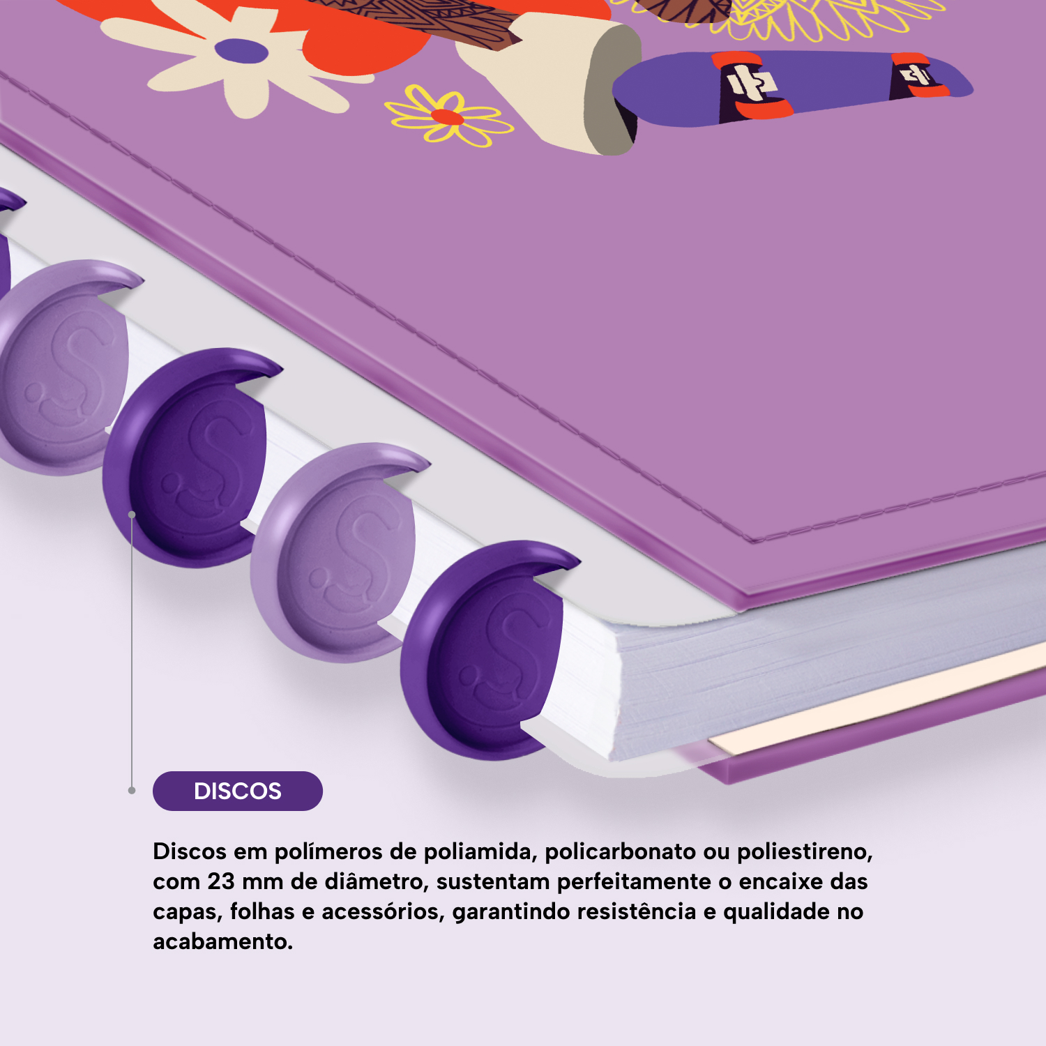Encadernado com 11 discos M de 23mm em polímero de nylon e/ou policarbonato coloridos, fabricados no Brasil.
