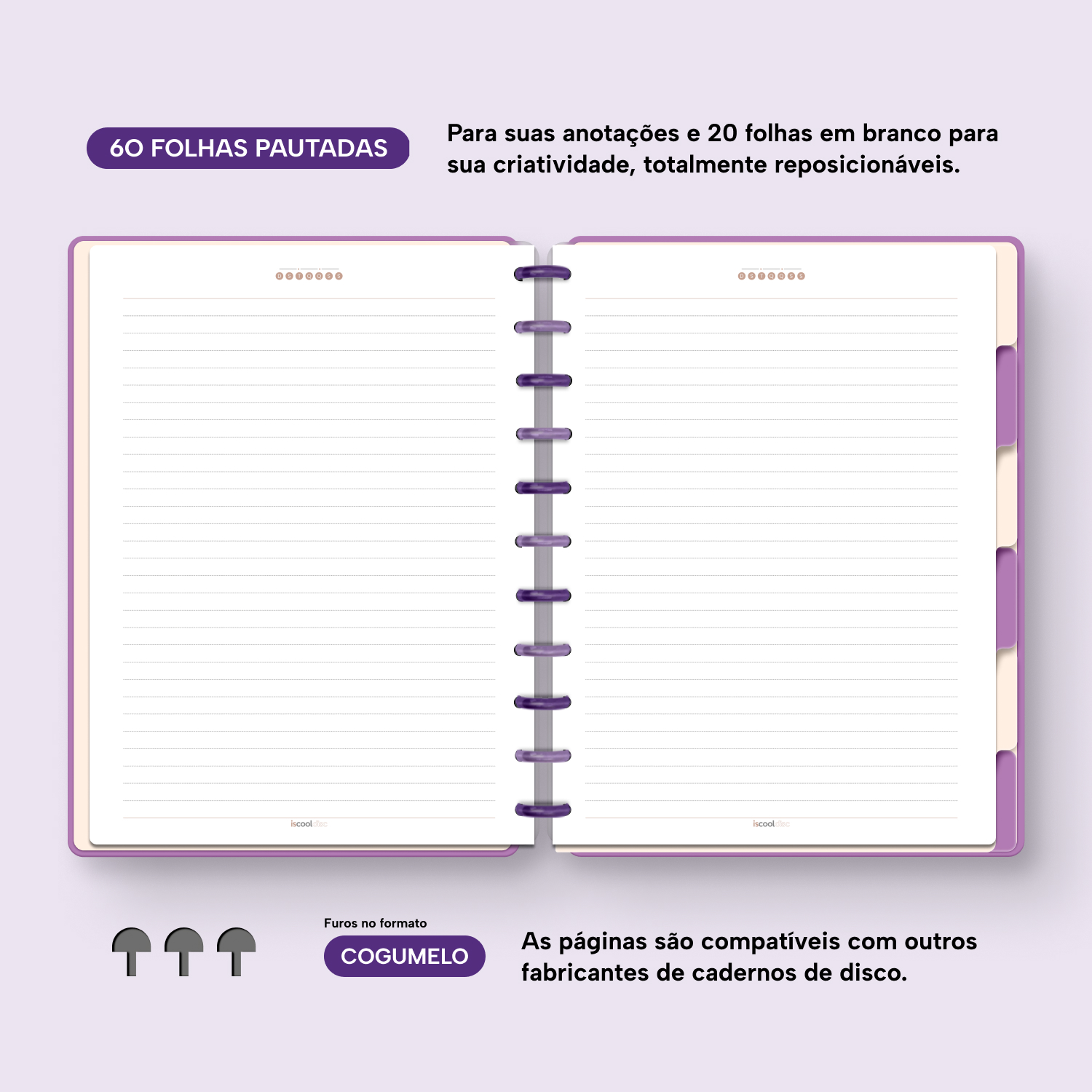 Com furos no formato de “cogumelo”, você poderá dar um “up” em seu caderno com nossos refis, além de ser compatível com outros fabricantes de cadernos de discos.