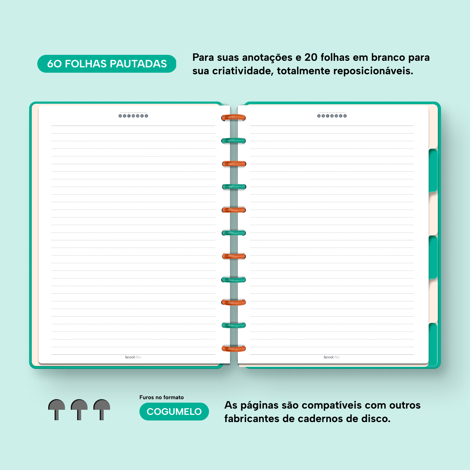 Com furos no formato de “cogumelo”, você poderá dar um “up” em seu caderno com nossos refis, além de ser compatível com outros fabricantes de cadernos de discos.