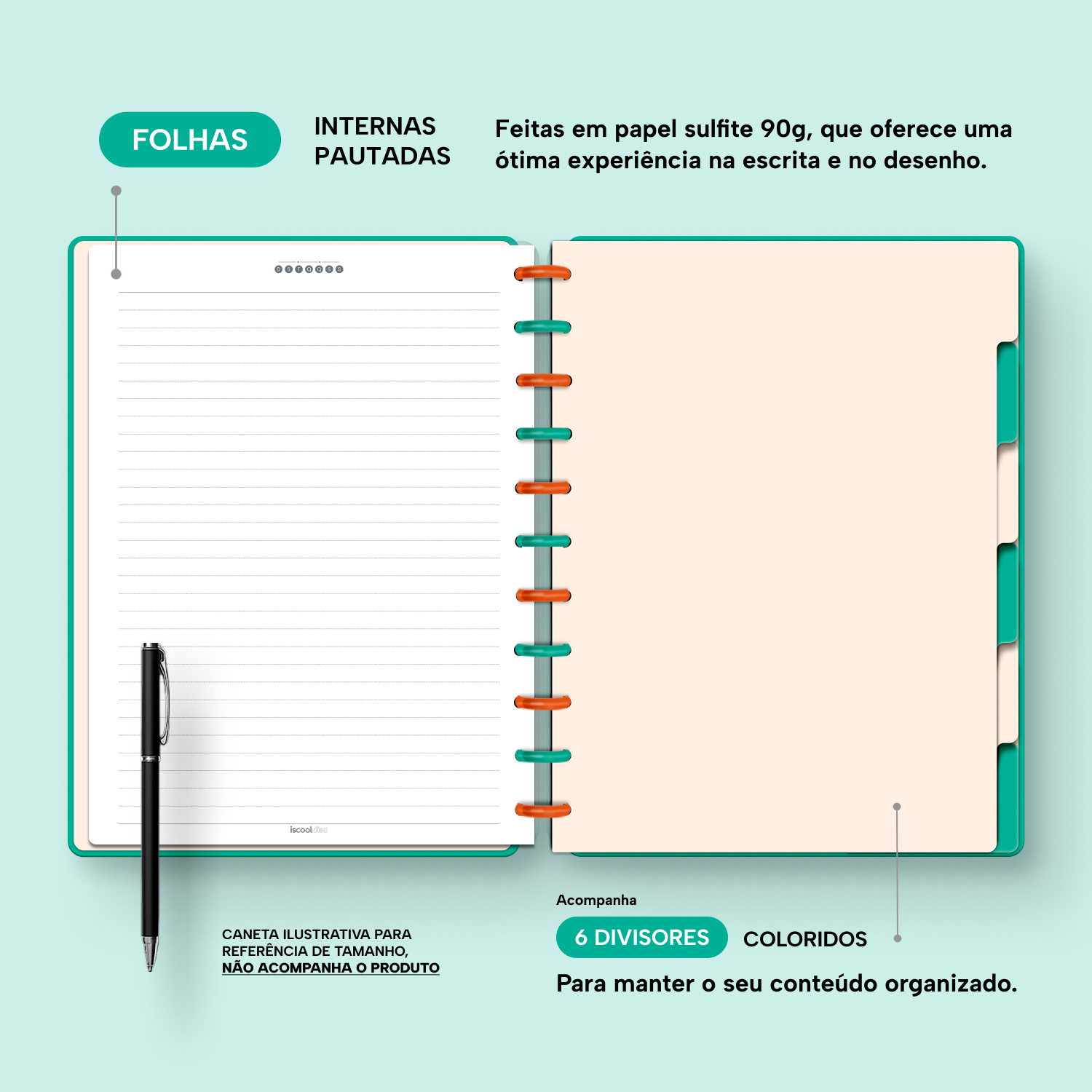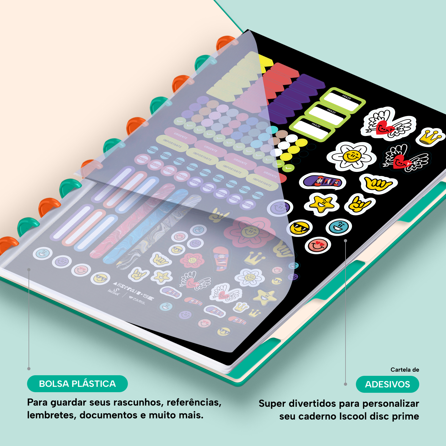 Além de tudo isso, o iscooldisc Prime conta com detalhes que fazem toda a diferença: elástico para fechamento da capa, muito mais estilo e privacidade para suas anotações; bolsa plástica para guardar seus rascunhos, referências, lembretes, documentos e uma cartela de adesivos incríveis, para que você possa personalizar seu caderno do seu jeitinho!