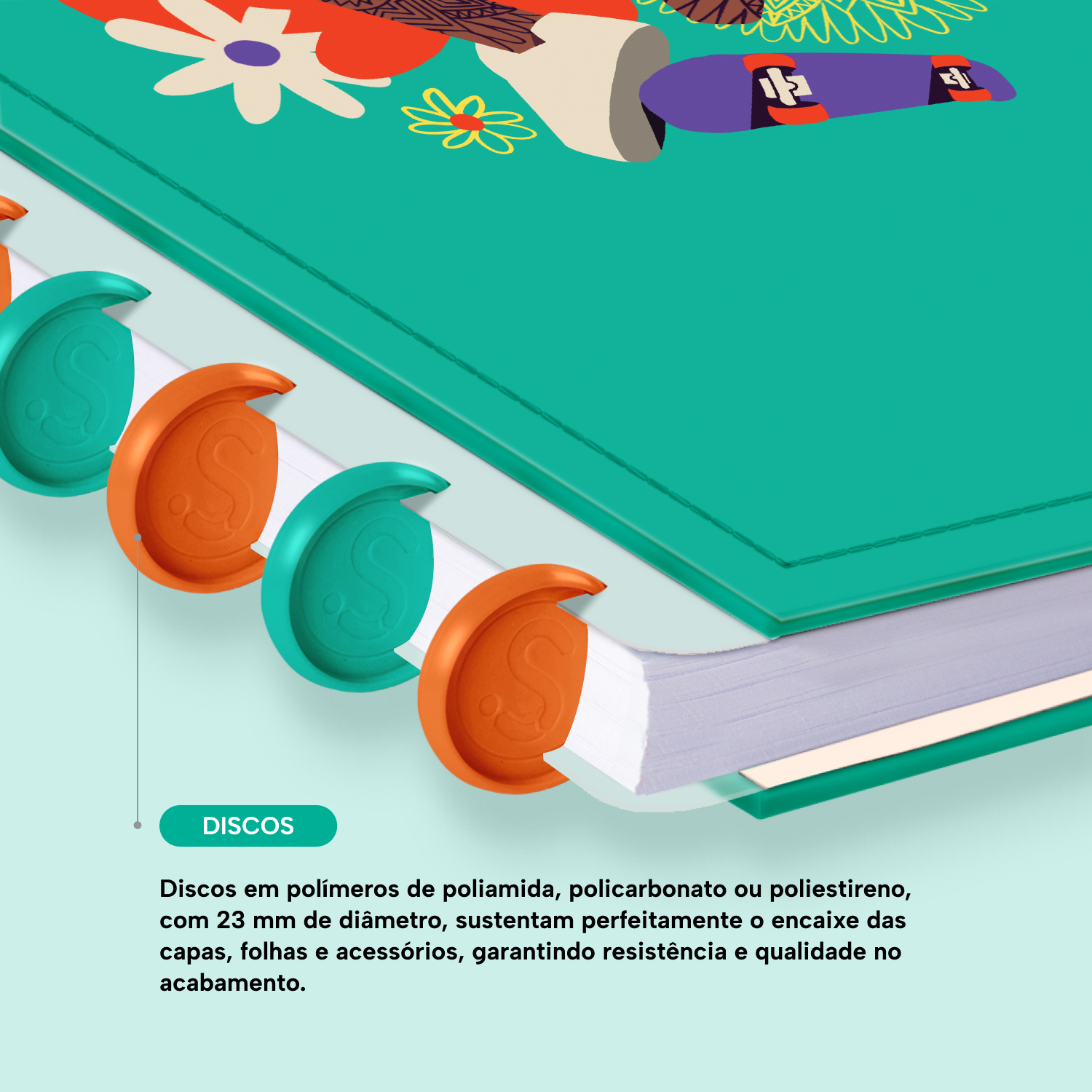 Encadernado com 11 discos M de 23mm em polímero de nylon e/ou policarbonato coloridos, fabricados no Brasil.