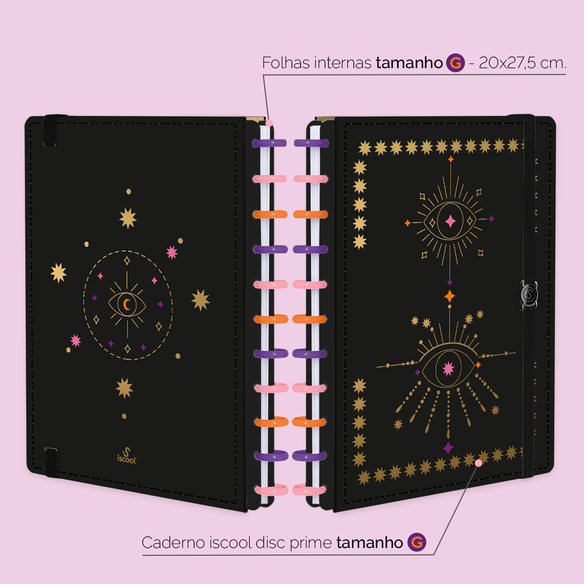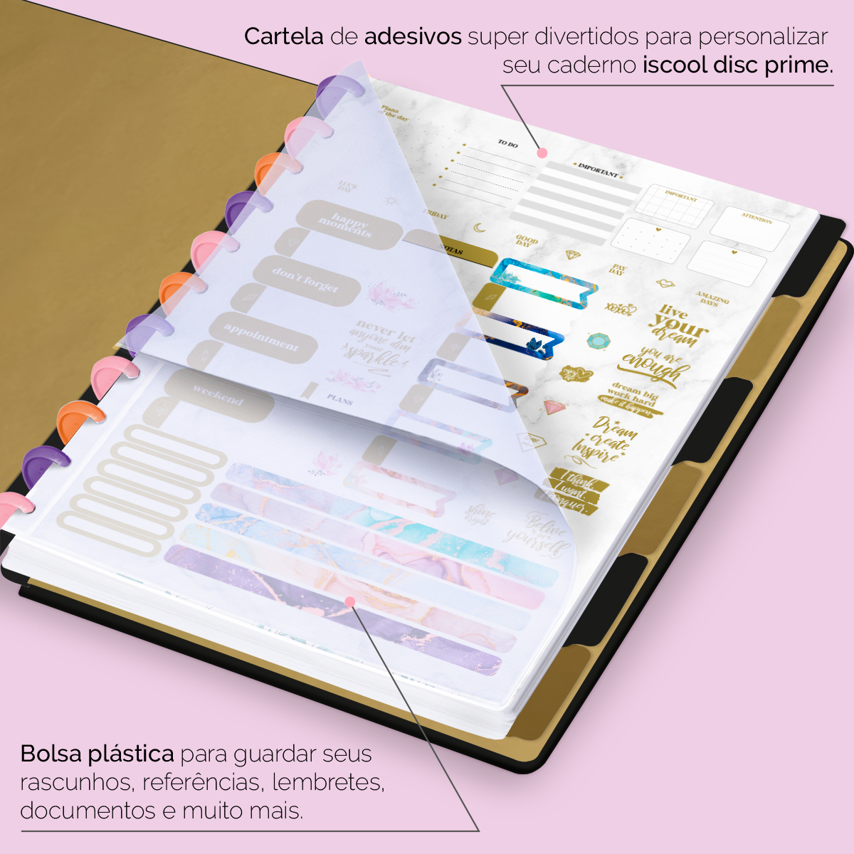 Além de tudo isso, o ISCOOL DISC PRIME UNIVERSITÁRIO, conta com detalhezinhos que fazem toda diferença: elástico para fechamento da capa, muito mais estilo e privacidade para suas anotações; bolsa plástica para guardar seus rascunhos, referências, lembretes, documentos e uma cartela de adesivos incríveis, para que você possa personalizar seu caderno do seu jeitinho!
