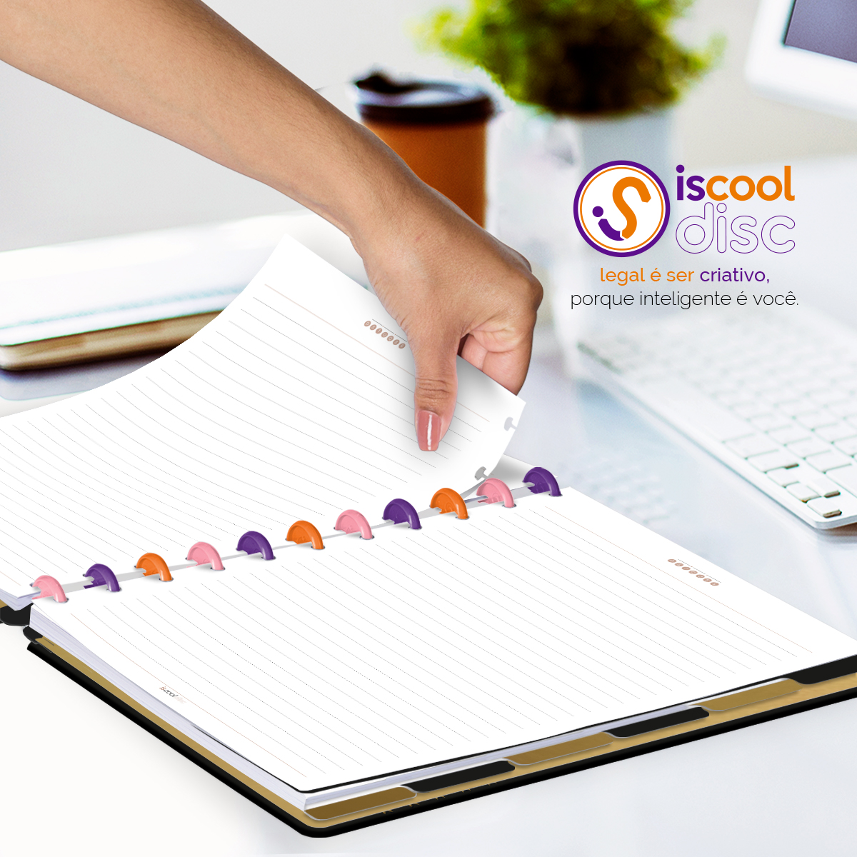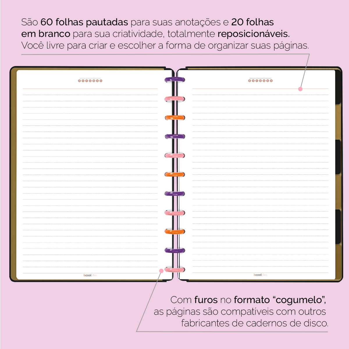 Encadernado com 11 discos G de 32mm em polímero de nylon e/ou policarbonato coloridos, fabricados no Brasil.