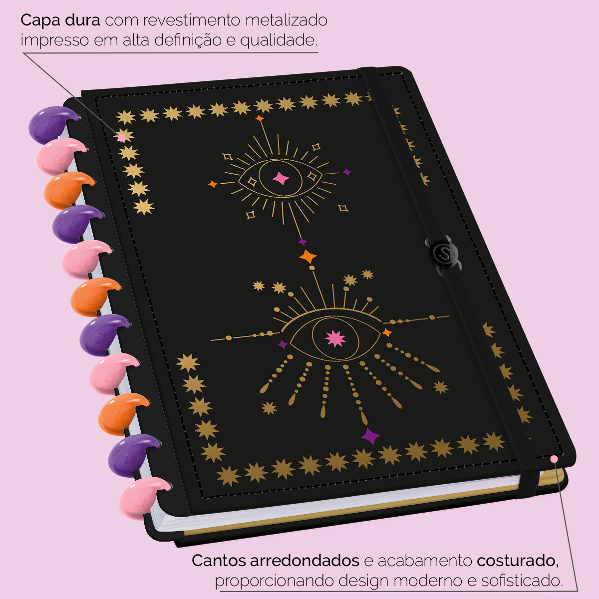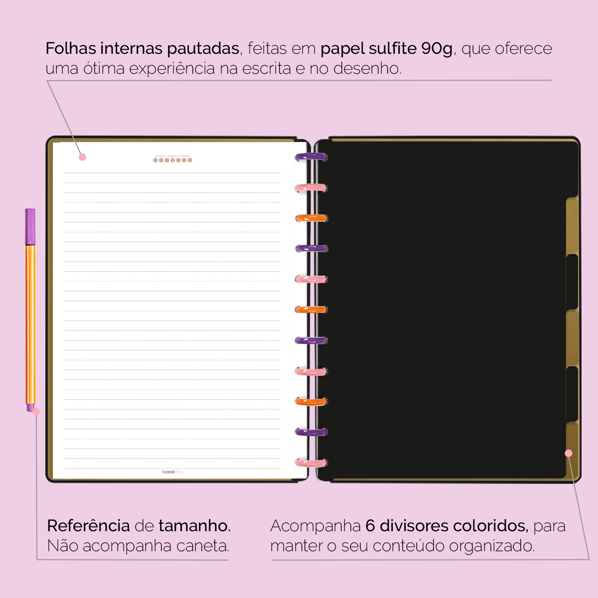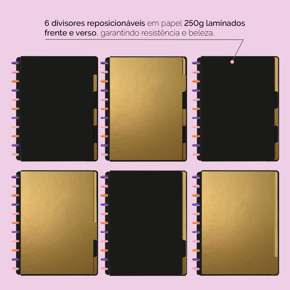 A capa é dura com impressão digital de alta definição, acompanha 6 lindas divisórias que você pode colocar em qualquer local do caderno, funcionando como o guia perfeito para sua organização.