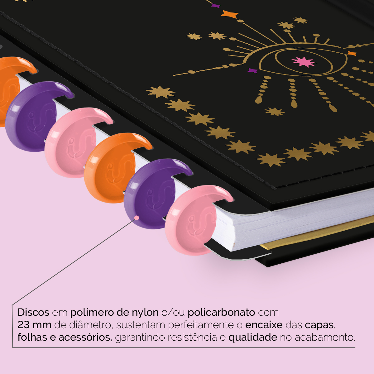 Os nossos discos são fabricados em polímero de nylon e/ou policarbonato, podem ser substituídos, proporcionando imensa variedade na combinação das cores, qualidade no acabamento e eficácia no encaixe das capas, folhas e acessórios.
