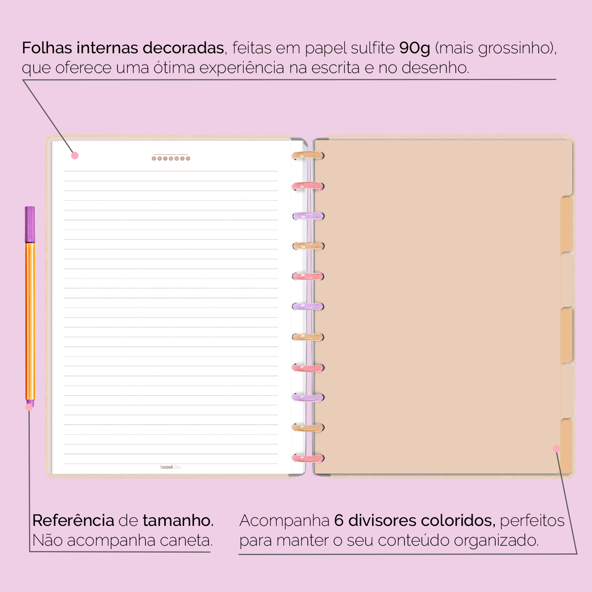A capa é dura com impressão digital de alta definição, acompanha 6 lindas divisórias que você pode colocar em qualquer local do caderno, funcionando como o guia perfeito para sua organização.