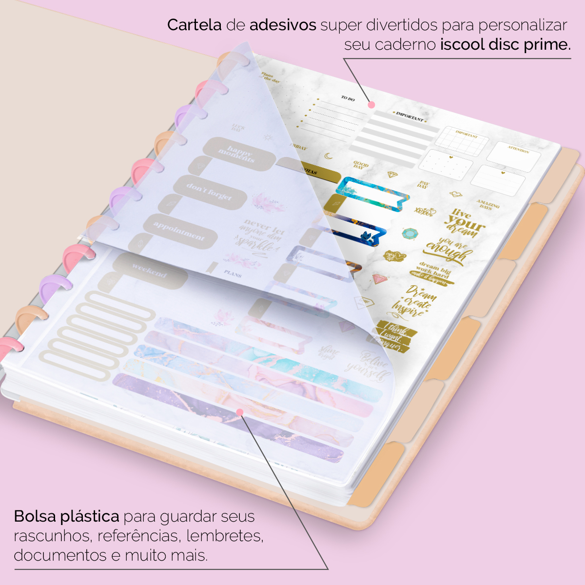 Além de tudo isso, o ISCOOL DISC PRIME UNIVERSITÁRIO, conta com detalhezinhos que fazem toda diferença: elástico para fechamento da capa, muito mais estilo e privacidade para suas anotações; bolsa plástica para guardar seus rascunhos, referências, lembretes, documentos e uma cartela de adesivos incríveis, para que você possa personalizar seu caderno do seu jeitinho!