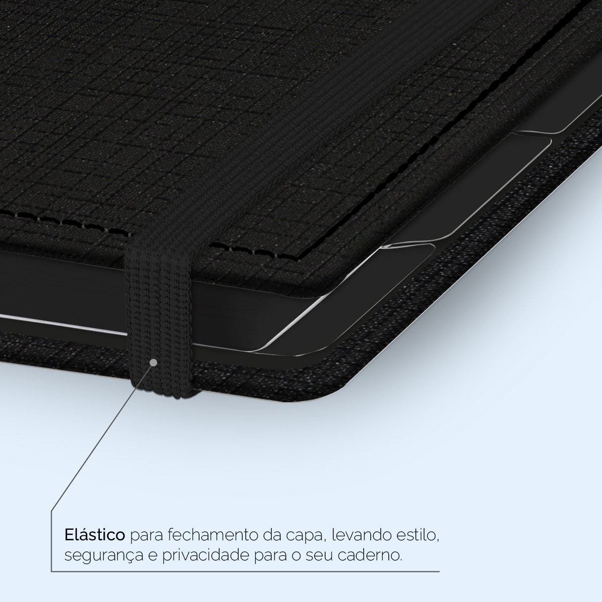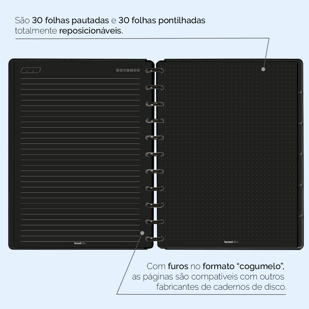 O miolo conta com 30 folhas pautadas em papel sulfite 120g 100% preto (aquele papel ainda mais “grossinho”) para que você use e abuse das suas canetas especiais e 30 folhas pontilhadas black, ideais para explorar seu lado mais criativo ou fazer bullet journal.