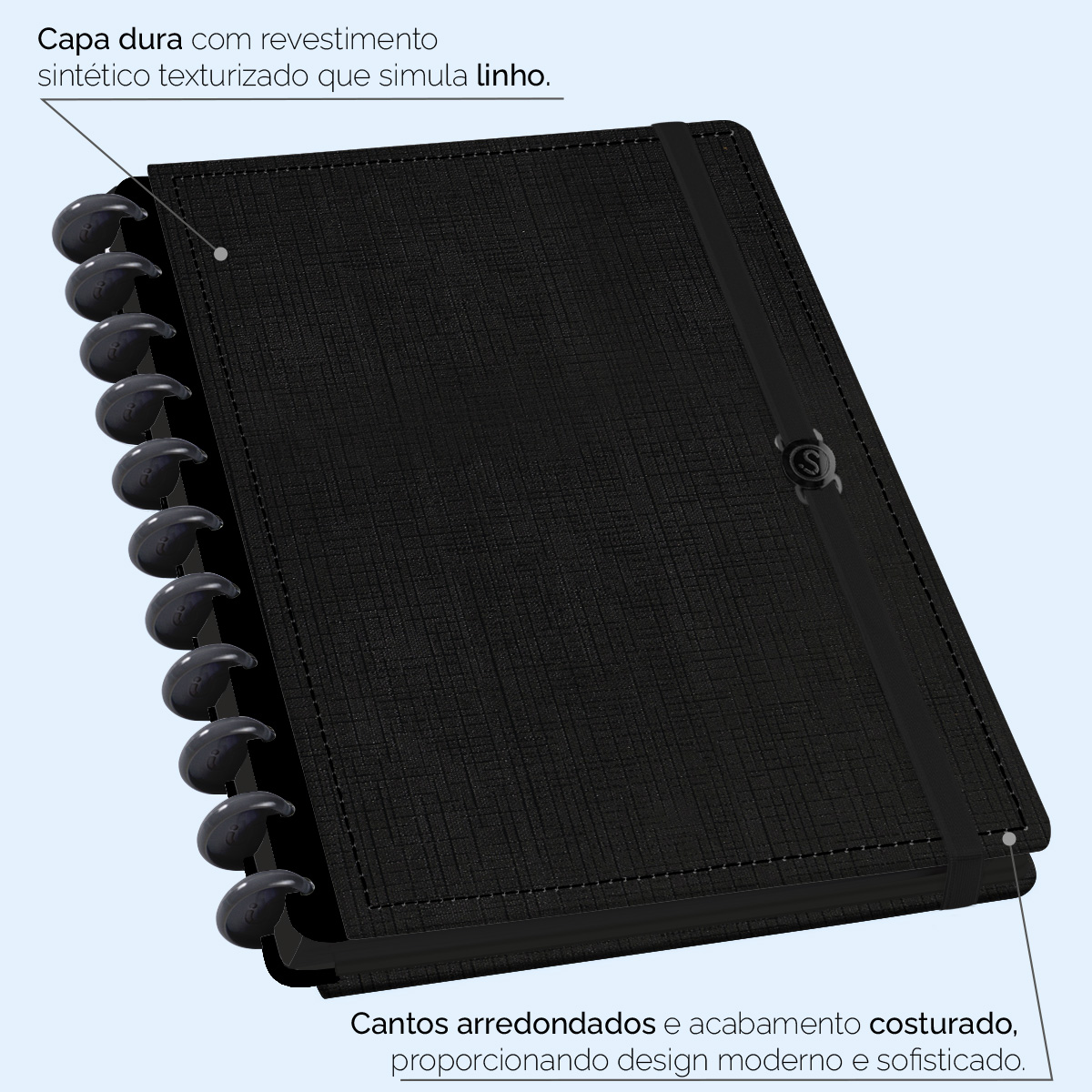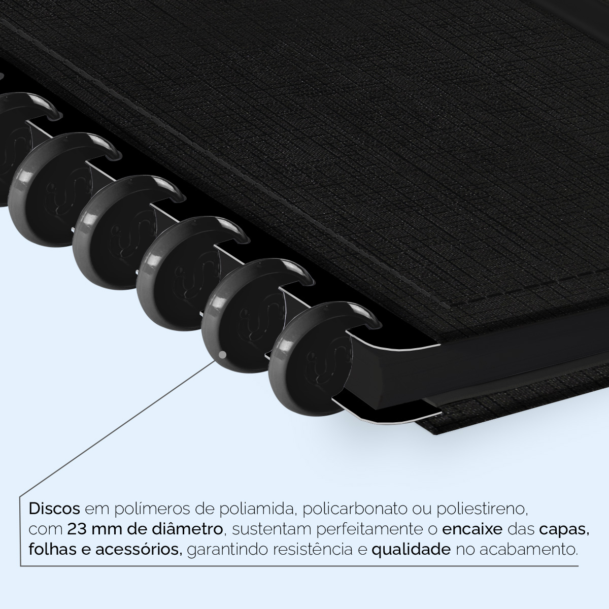 Encadernado com 11 discos M de 23mm em polímero de nylon e/ou policarbonato, fabricados no Brasil.
