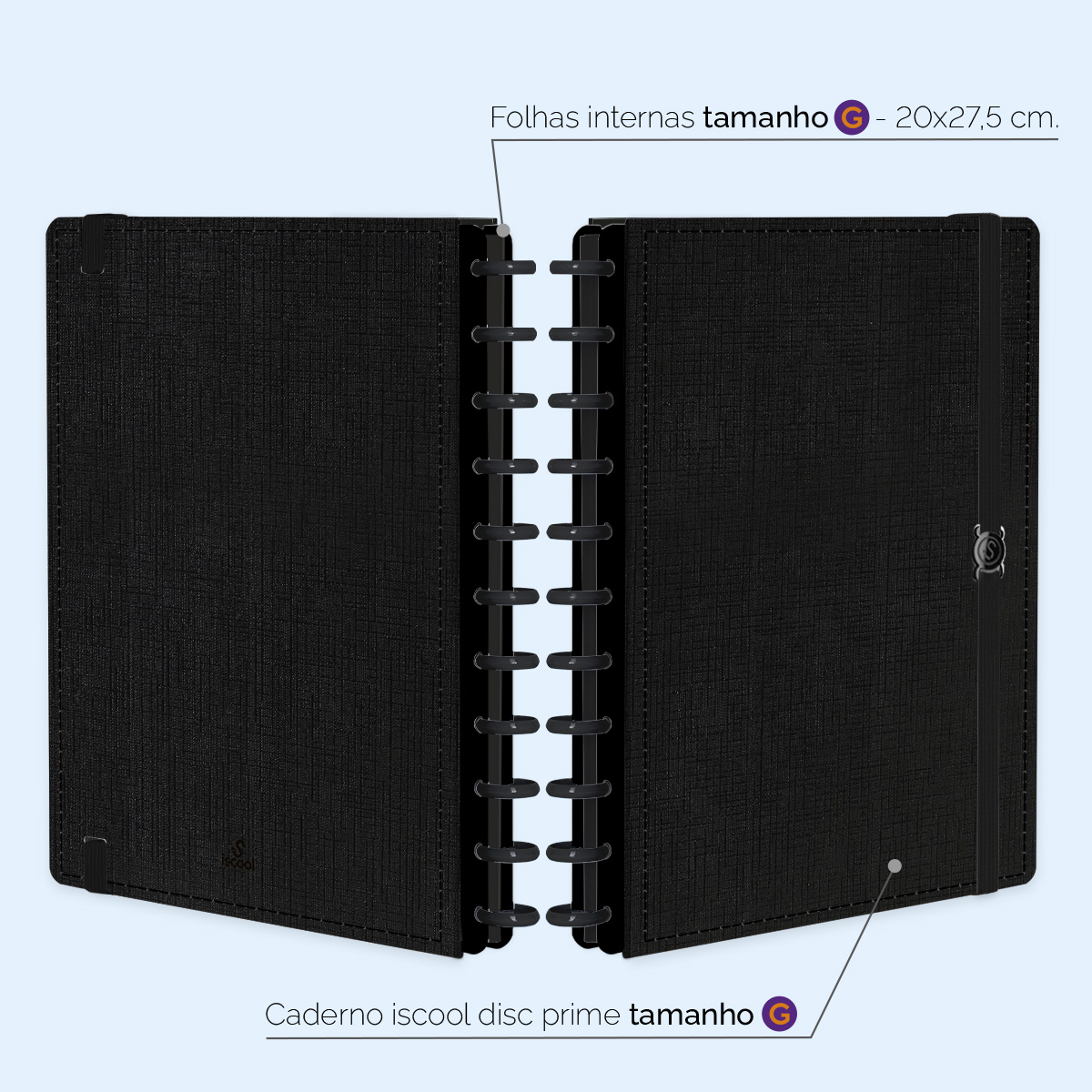 Além de tudo isso, o iscooldisc Prime Blackout, conta com detalhezinhos que fazem toda diferença: elástico para fechamento da capa, muito mais estilo e privacidade para suas anotações; bolsa plástica para guardar seus rascunhos, referências, lembretes, documentos e uma cartela de adesivos incríveis, para que você possa personalizar seu caderno do seu jeitinho!