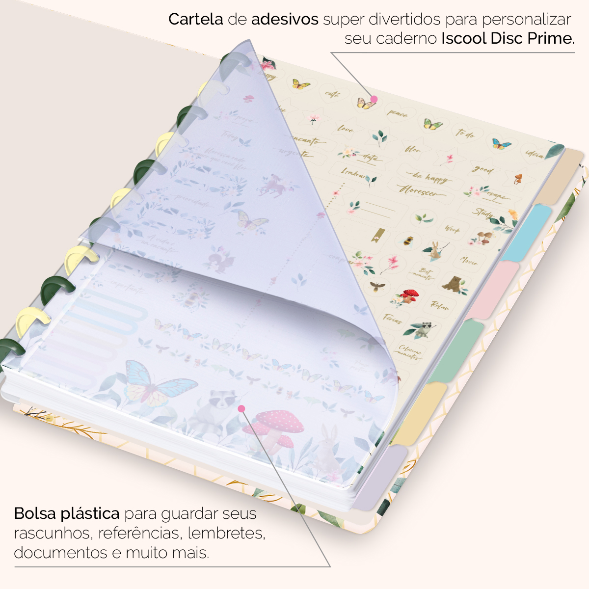 Além de tudo isso, o ISCOOL DISC PRIME UNIVERSITÁRIO, conta com detalhezinhos que fazem toda diferença: elástico para fechamento da capa, muito mais estilo e privacidade para suas anotações; bolsa plástica para guardar seus rascunhos, referências, lembretes, documentos e uma cartela de adesivos incríveis, para que você possa personalizar seu caderno do seu jeitinho!