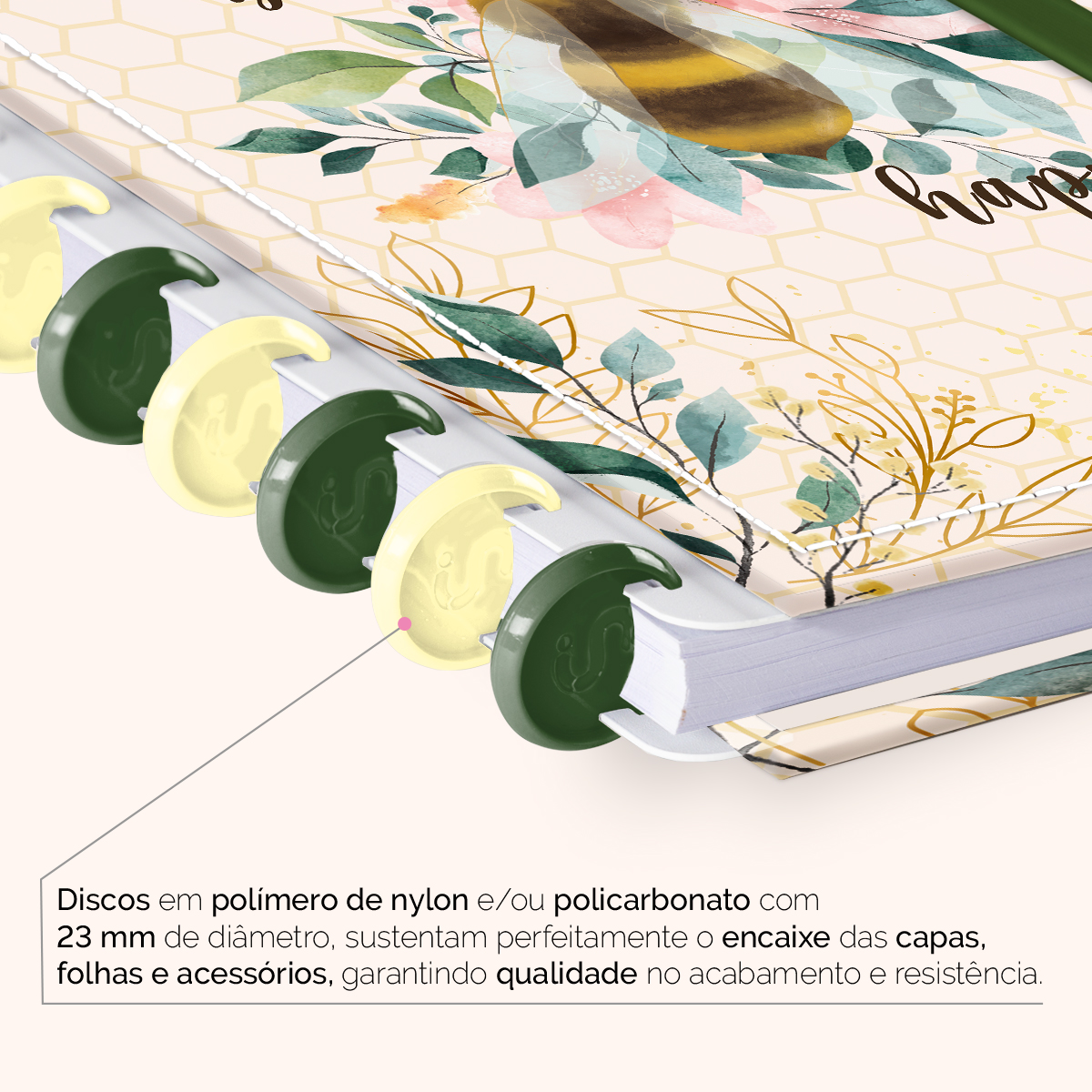 Encadernado com 11 discos G de 32mm em polímero de nylon e/ou policarbonato coloridos, fabricados no Brasil.