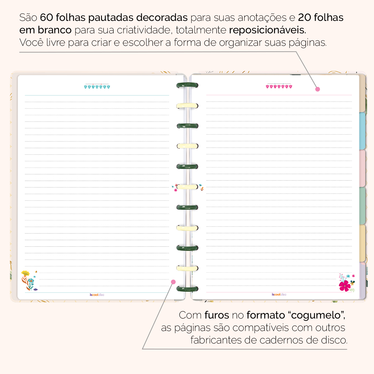 O miolo conta com 120 folhas pautadas decoradas em papel sulfite 90g, (aquele papel mais “grossinho”) para que você use e abuse das suas canetas especiais e 20 folhas em branco, ideais para explorar seu lado mais criativo ou até imprimir nelas.