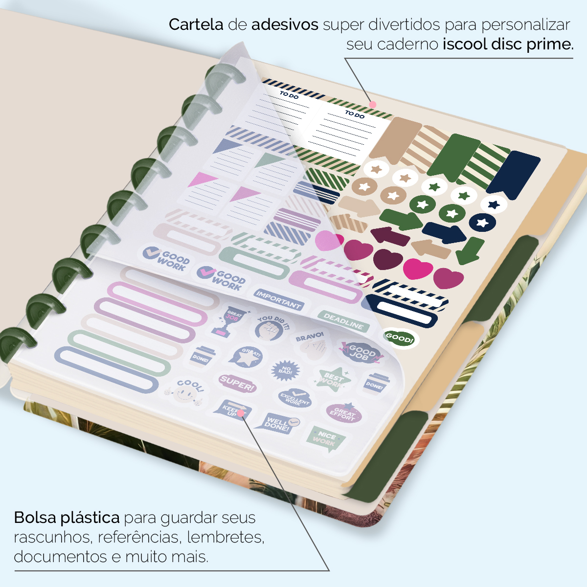Além de tudo isso, o iscooldisc Prime Blackout, conta com detalhezinhos que fazem toda diferença: elástico para fechamento da capa, muito mais estilo e privacidade para suas anotações; bolsa plástica para guardar seus rascunhos, referências, lembretes, documentos e uma cartela de adesivos incríveis, para que você possa personalizar seu caderno do seu jeitinho!