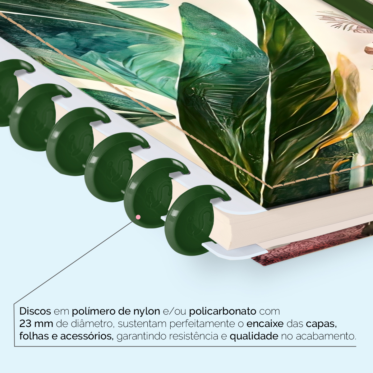 Encadernado com 11 discos M de 23mm em polímero de nylon e/ou policarbonato, fabricados no Brasil.
