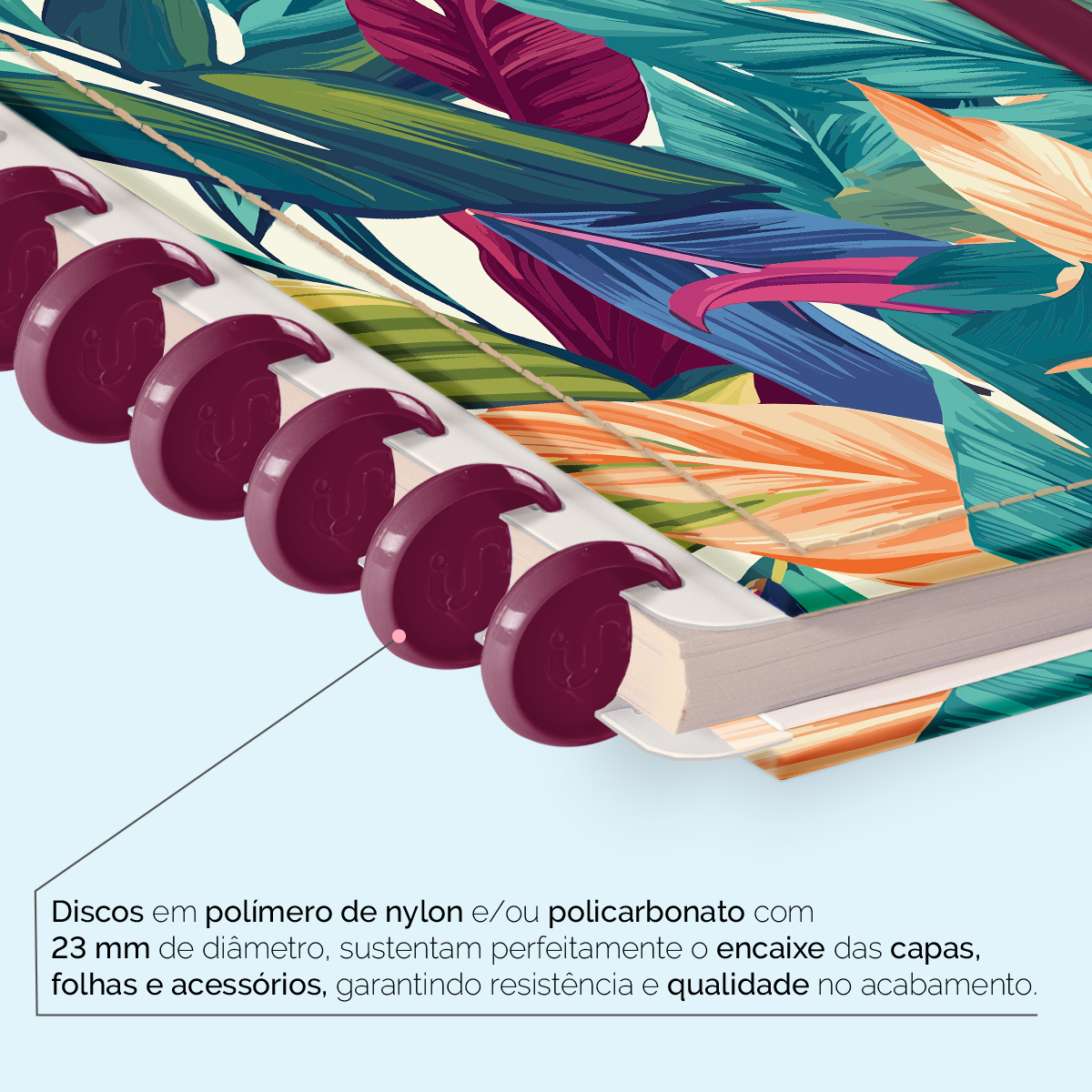 Encadernado com 11 discos G de 32mm em polímero de nylon e/ou policarbonato coloridos, fabricados no Brasil.