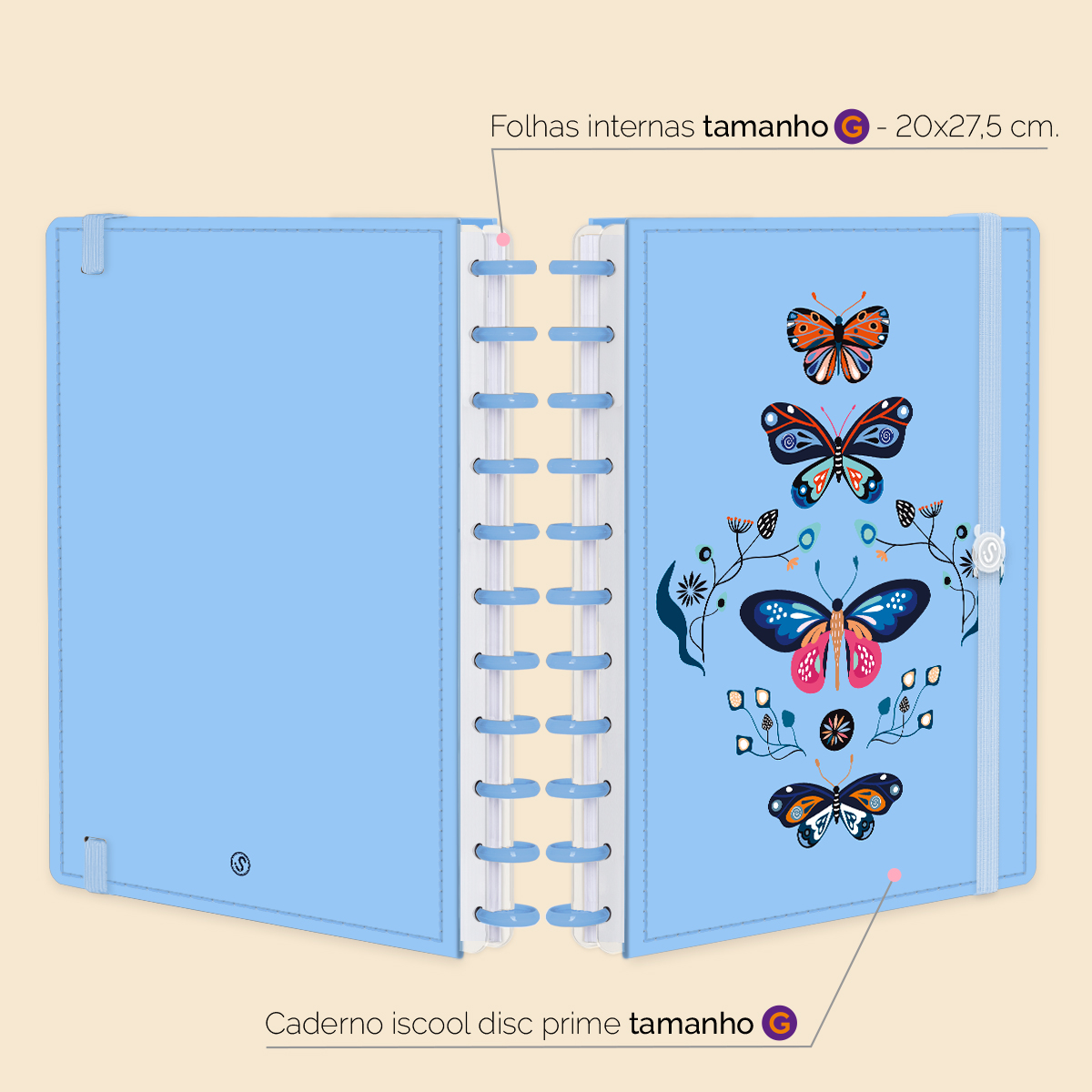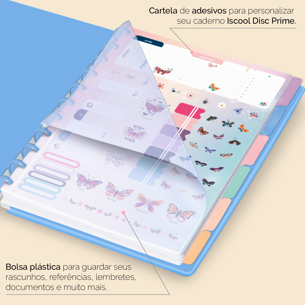 Além de tudo isso, o ISCOOL DISC PRIME UNIVERSITÁRIO, conta com detalhezinhos que fazem toda diferença: elástico para fechamento da capa, muito mais estilo e privacidade para suas anotações; bolsa plástica para guardar seus rascunhos, referências, lembretes, documentos e uma cartela de adesivos incríveis, para que você possa personalizar seu caderno do seu jeitinho!