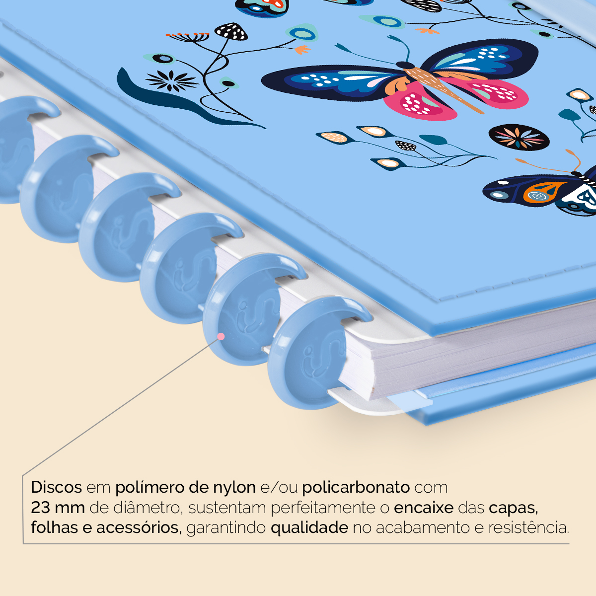 Encadernado com 11 discos G de 32mm em polímero de nylon e/ou policarbonato coloridos, fabricados no Brasil.