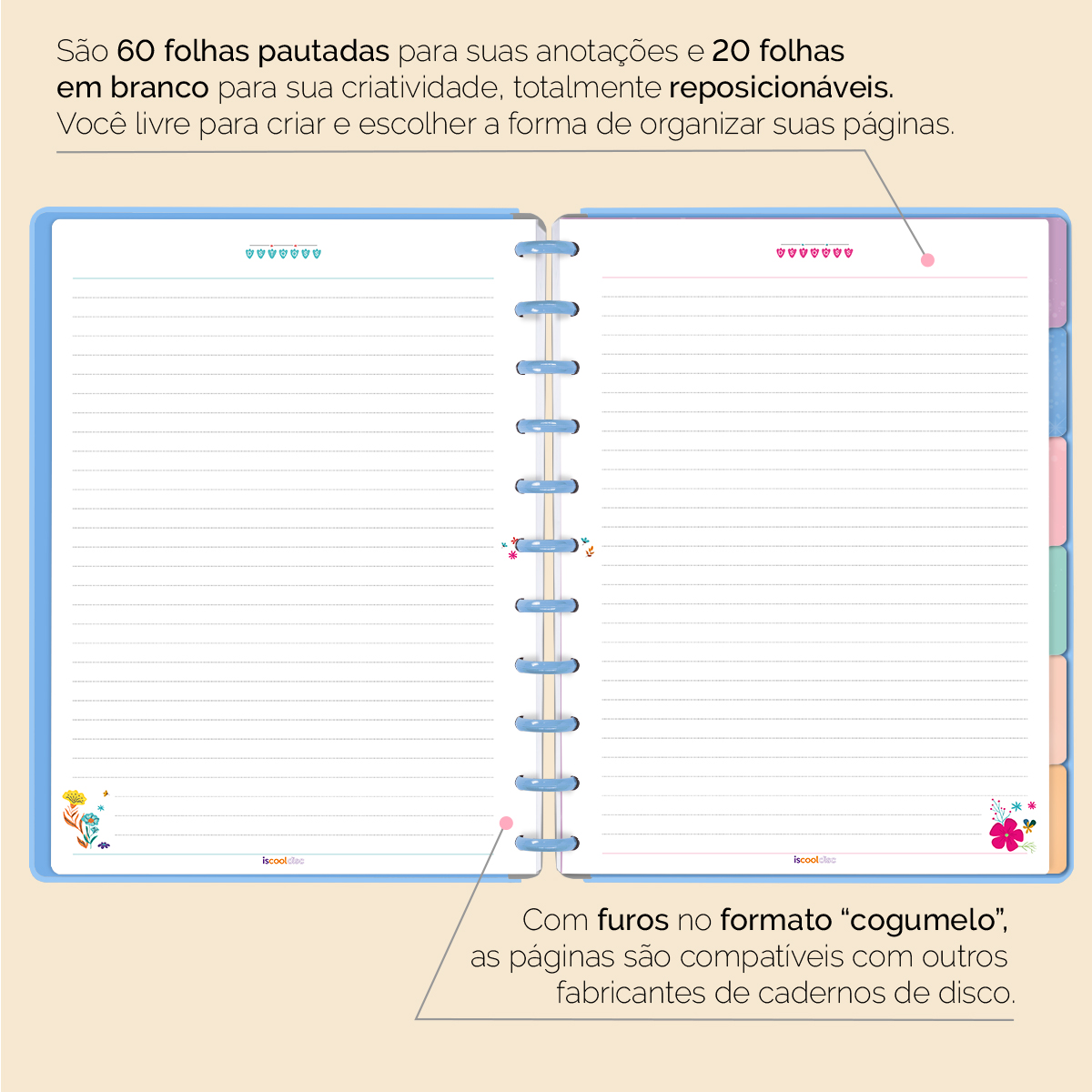 O miolo conta com 120 folhas pautadas decoradas em papel sulfite 90g, (aquele papel mais “grossinho”) para que você use e abuse das suas canetas especiais e 20 folhas em branco, ideais para explorar seu lado mais criativo ou até imprimir nelas.