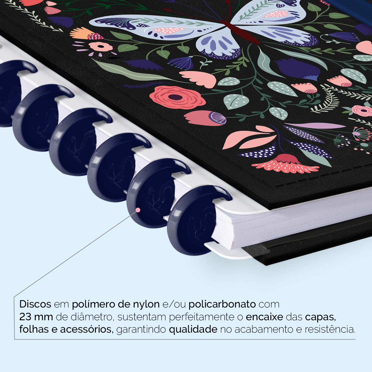 Os nossos discos são fabricados em polímero de nylon e/ou policarbonato, podem ser substituídos, proporcionando imensa variedade na combinação das cores, qualidade no acabamento e eficácia no encaixe das capas, folhas e acessórios.
