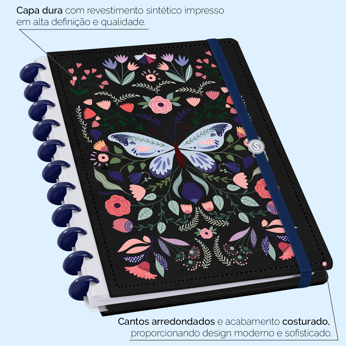 A capa é dura com impressão digital de alta definição, acompanha 6 lindas divisórias que você pode colocar em qualquer local do caderno, funcionando como o guia perfeito para sua organização.