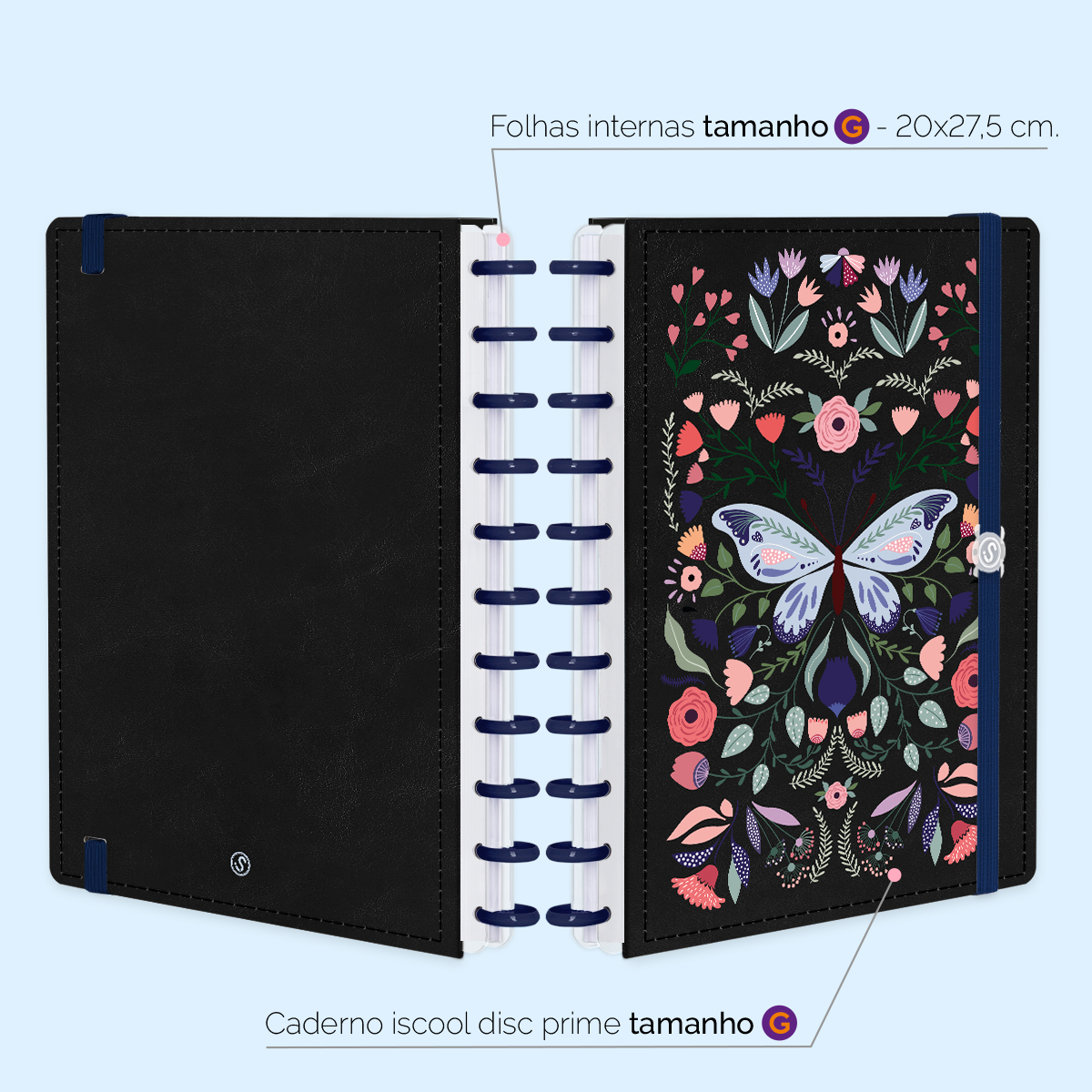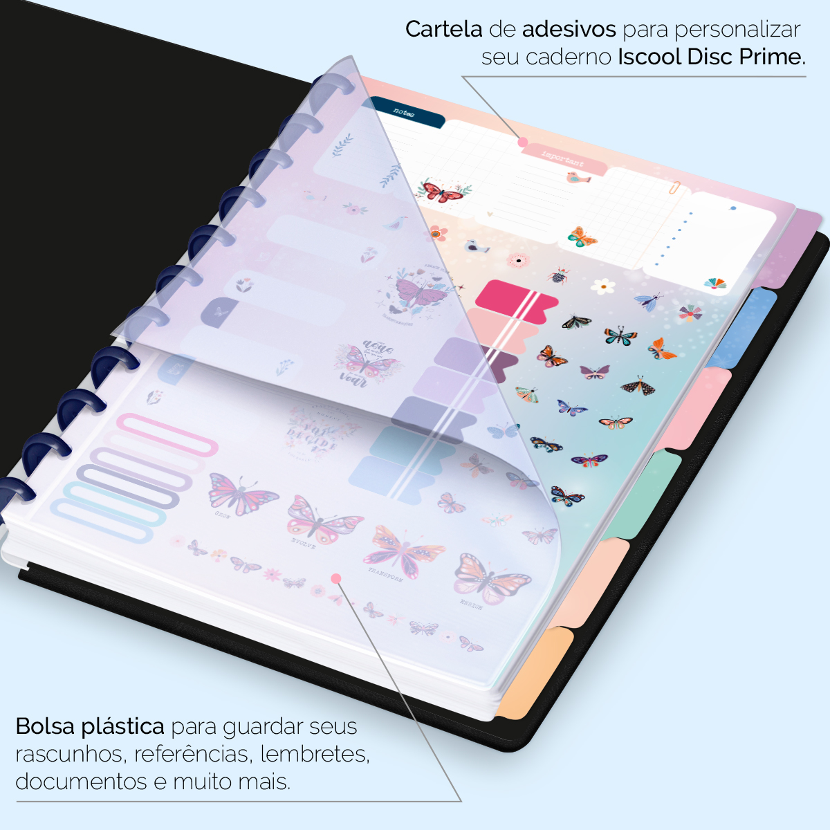 Além de tudo isso, o ISCOOL DISC PRIME UNIVERSITÁRIO, conta com detalhezinhos que fazem toda diferença: elástico para fechamento da capa, muito mais estilo e privacidade para suas anotações; bolsa plástica para guardar seus rascunhos, referências, lembretes, documentos e uma cartela de adesivos incríveis, para que você possa personalizar seu caderno do seu jeitinho!