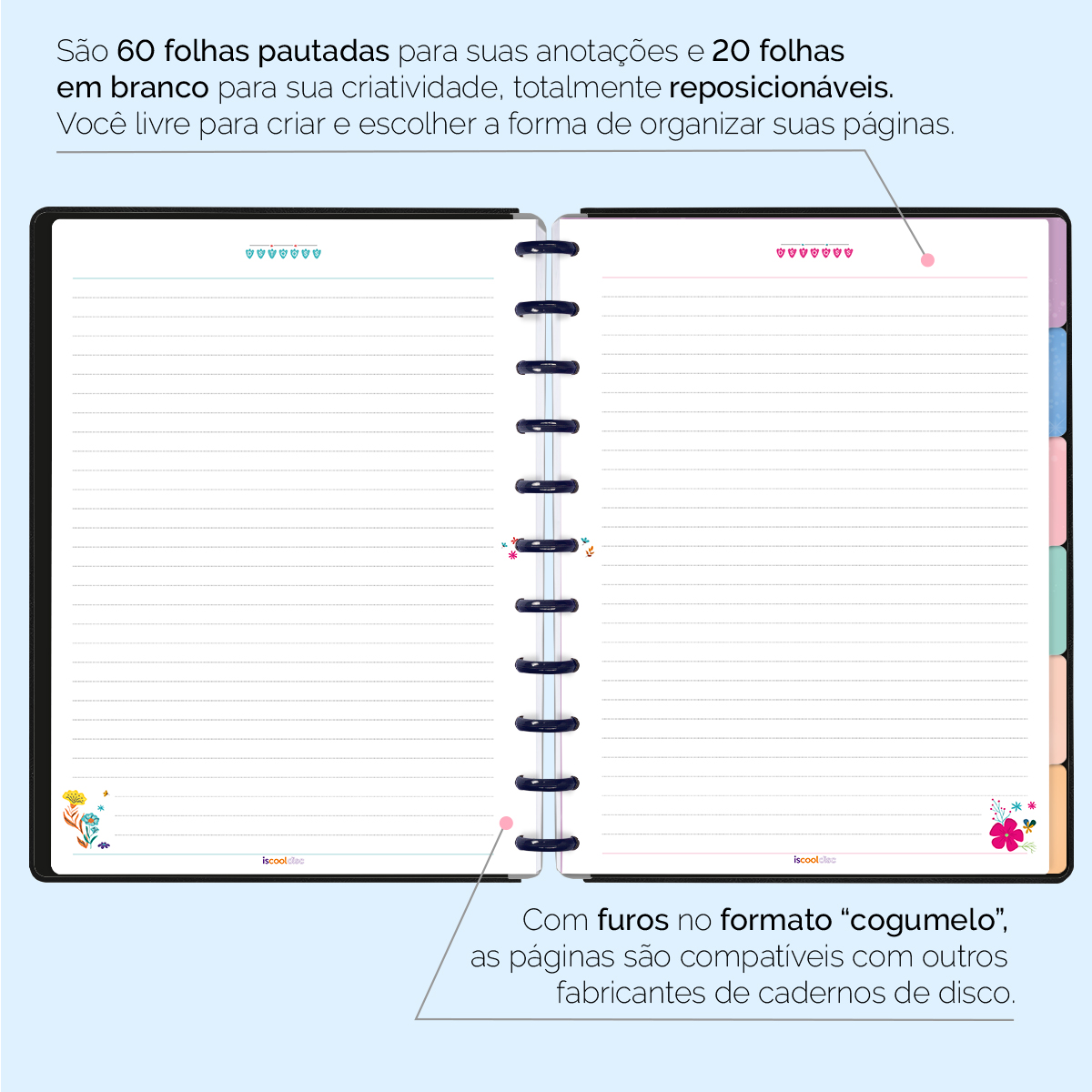 Com furos no formato de “cogumelo”, você poderá dar um “up” em seu caderno com nossos refis, além de ser compatível com outros fabricantes de cadernos de discos.