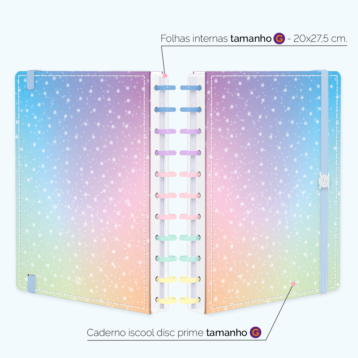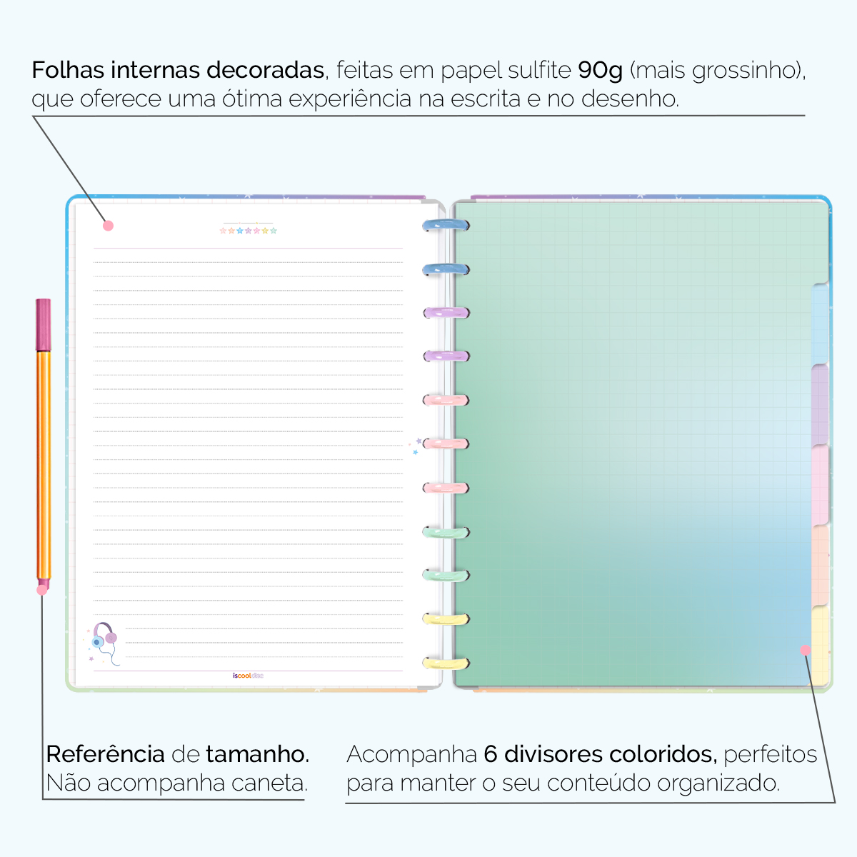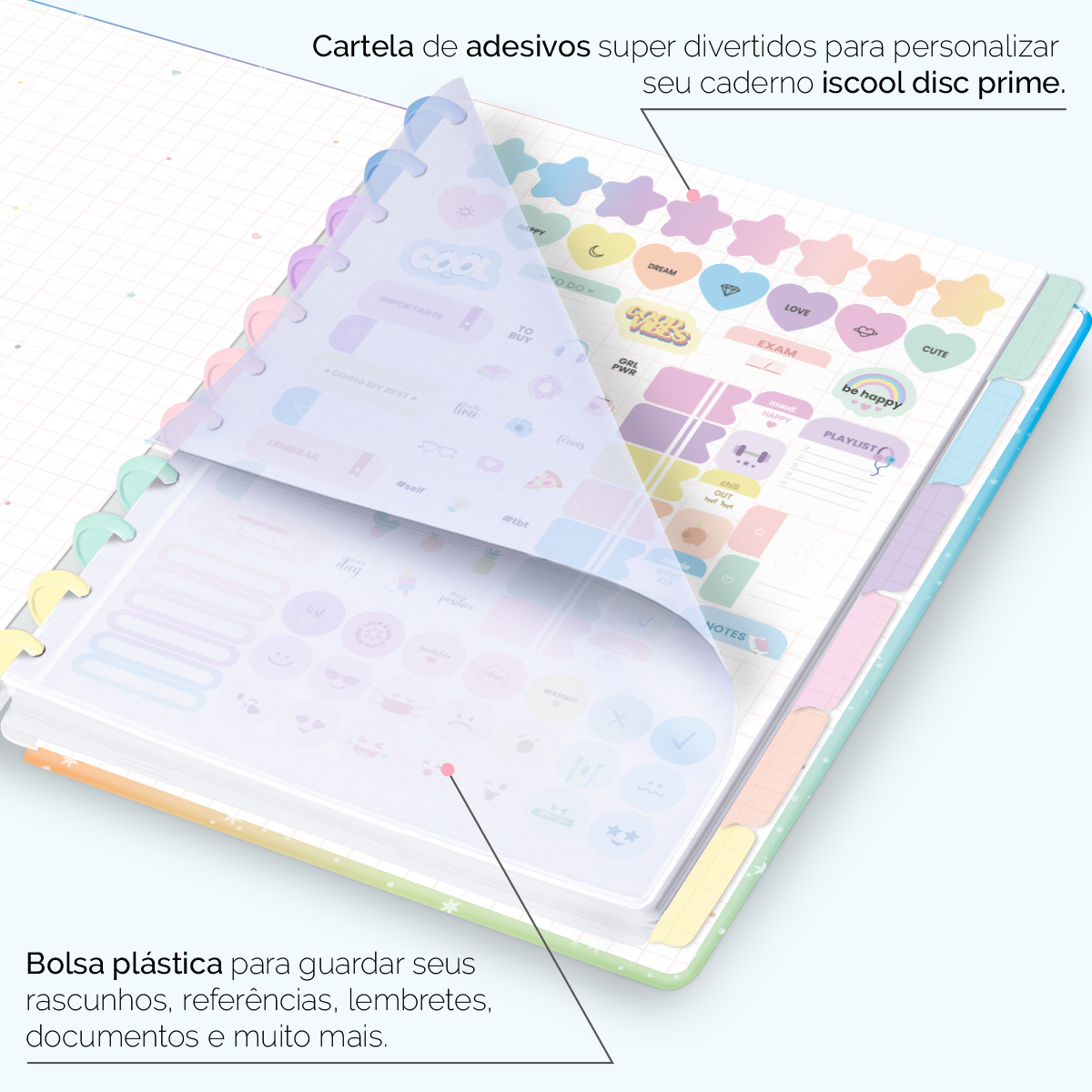Além de tudo isso, o ISCOOL DISC PRIME UNIVERSITÁRIO, conta com detalhezinhos que fazem toda diferença: elástico para fechamento da capa, muito mais estilo e privacidade para suas anotações; bolsa plástica para guardar seus rascunhos, referências, lembretes, documentos e uma cartela de adesivos incríveis, para que você possa personalizar seu caderno do seu jeitinho!