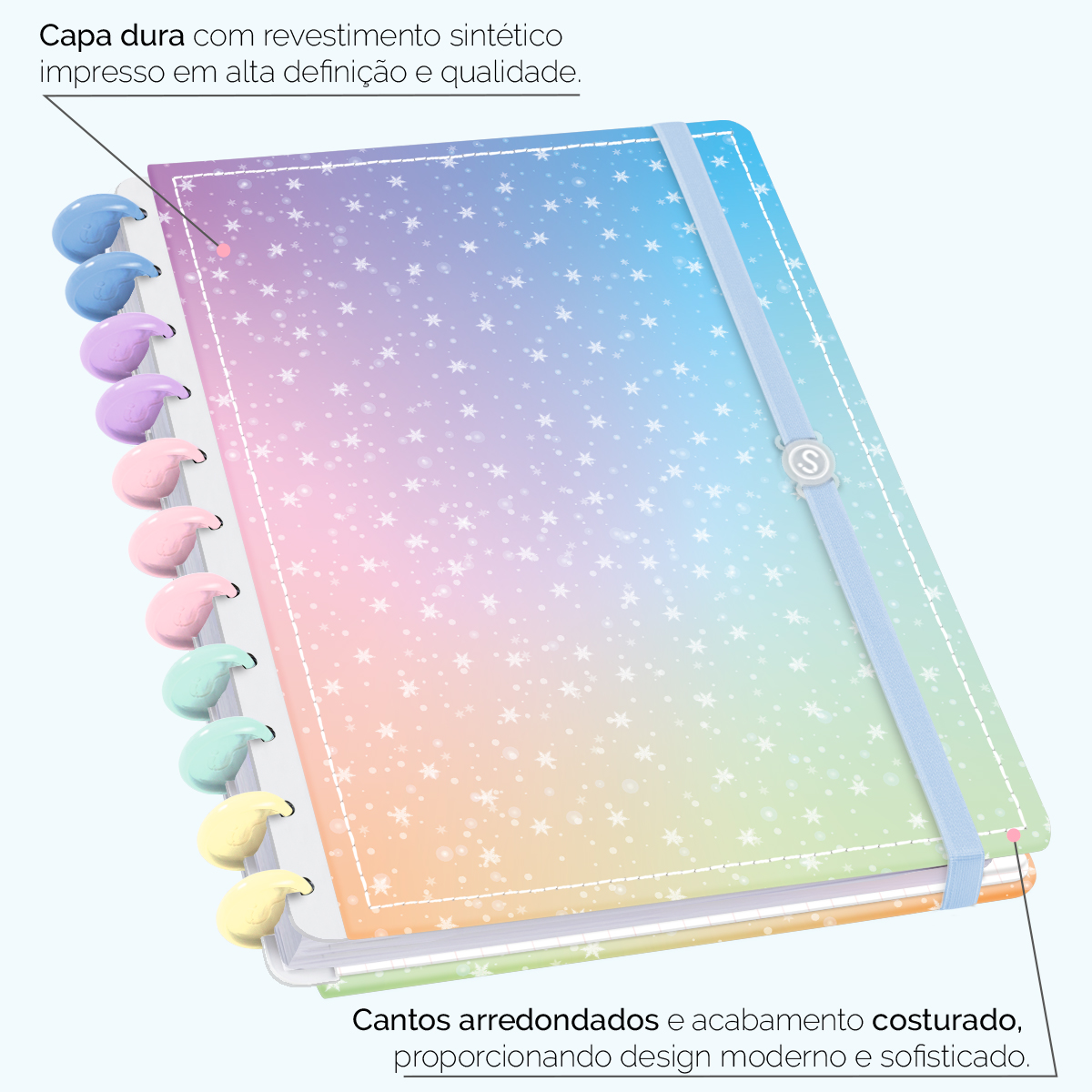 A capa é dura com impressão digital de alta definição, acompanha 6 lindas divisórias que você pode colocar em qualquer local do caderno, funcionando como o guia perfeito para sua organização.