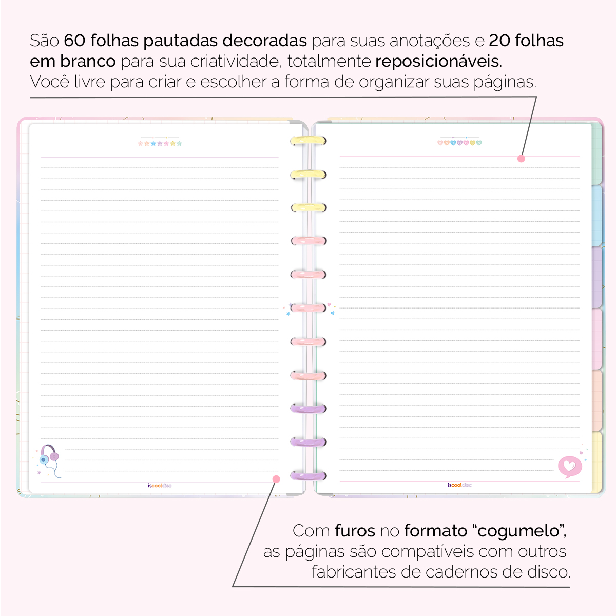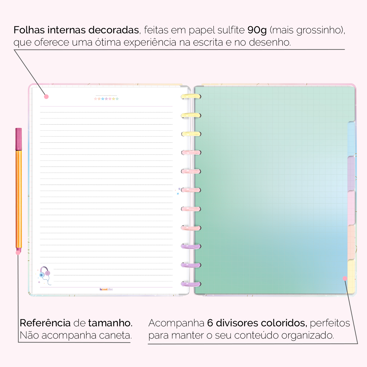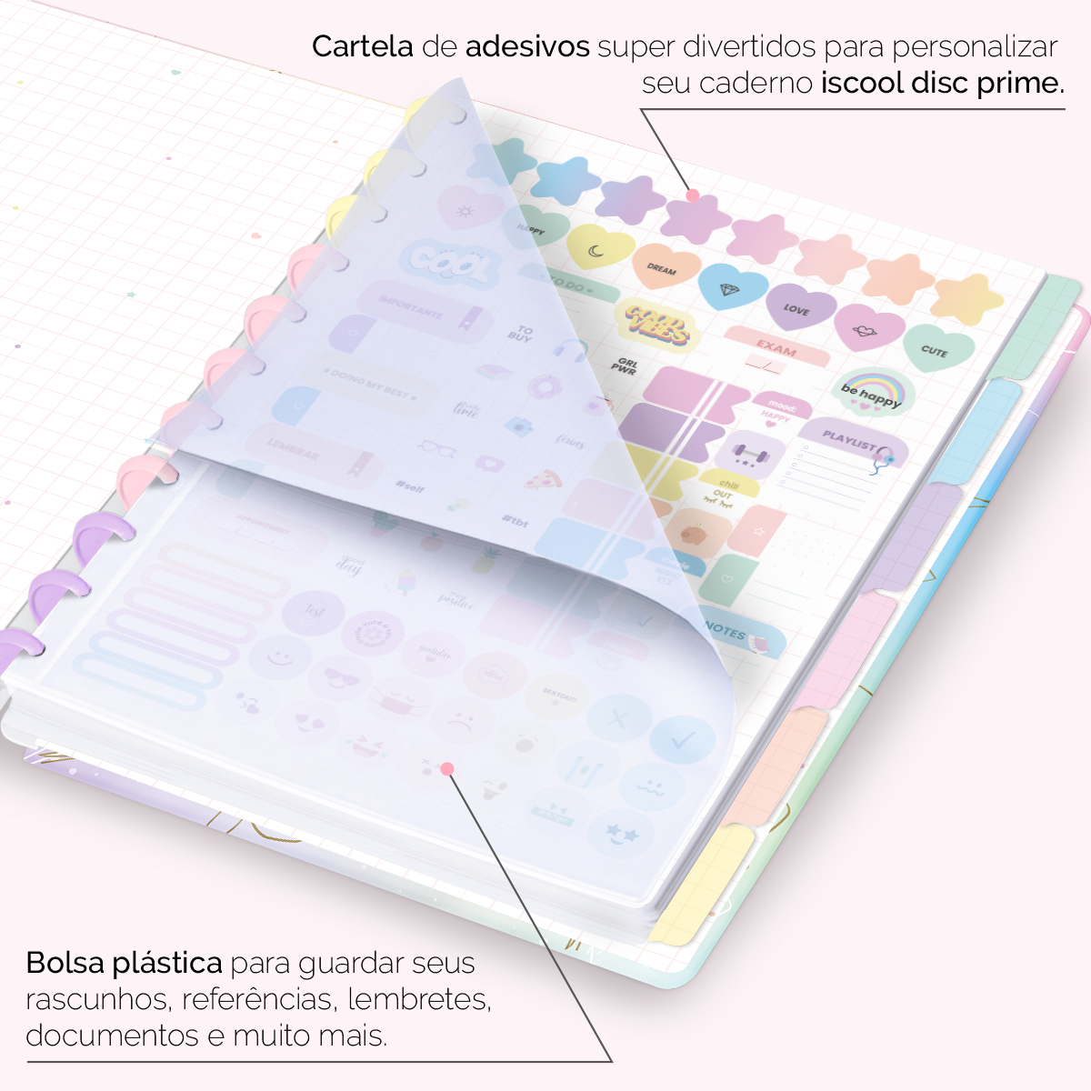 Além de tudo isso, o ISCOOL DISC PRIME UNIVERSITÁRIO, conta com detalhezinhos que fazem toda diferença: elástico para fechamento da capa, muito mais estilo e privacidade para suas anotações; bolsa plástica para guardar seus rascunhos, referências, lembretes, documentos e uma cartela de adesivos incríveis, para que você possa personalizar seu caderno do seu jeitinho!