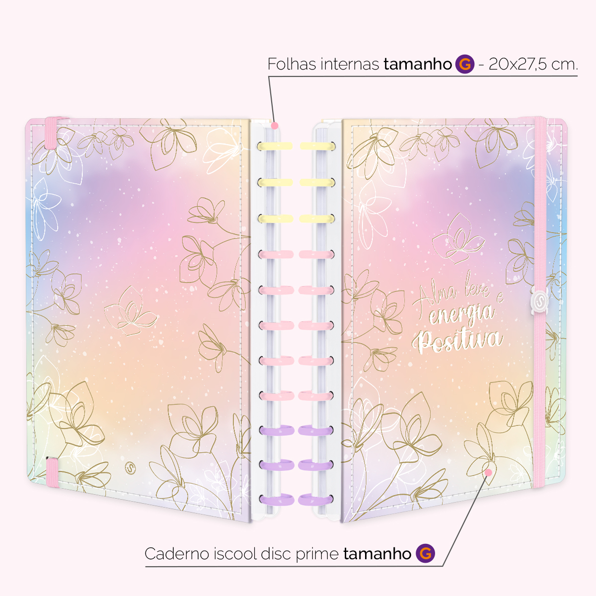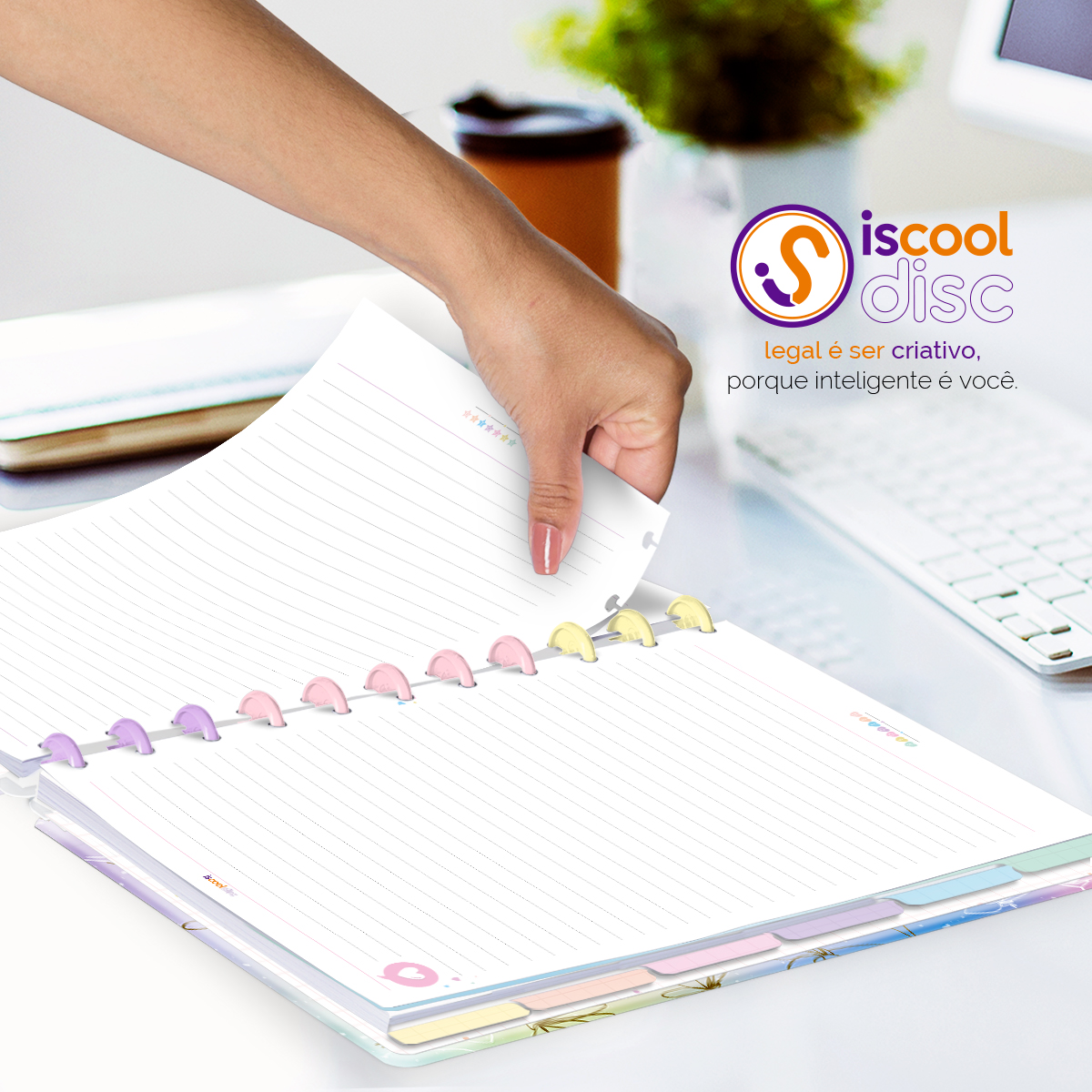 Encadernado com 11 discos G de 32mm em polímero de nylon e/ou policarbonato coloridos, fabricados no Brasil.
