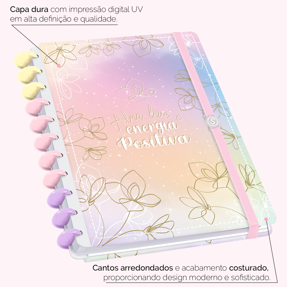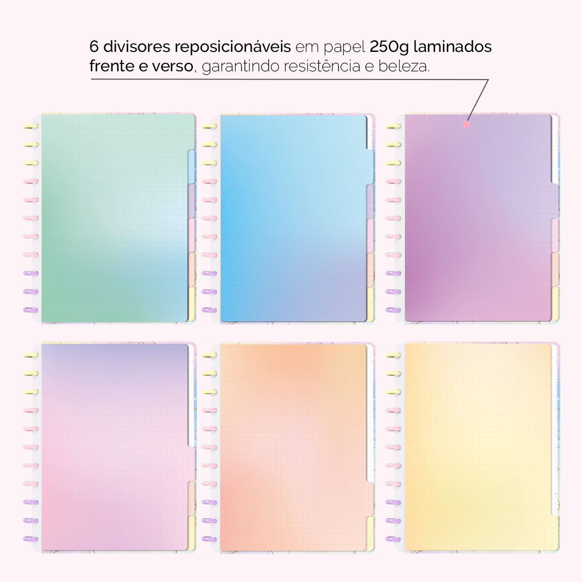 A capa é dura com impressão digital de alta definição, acompanha 6 lindas divisórias que você pode colocar em qualquer local do caderno, funcionando como o guia perfeito para sua organização.