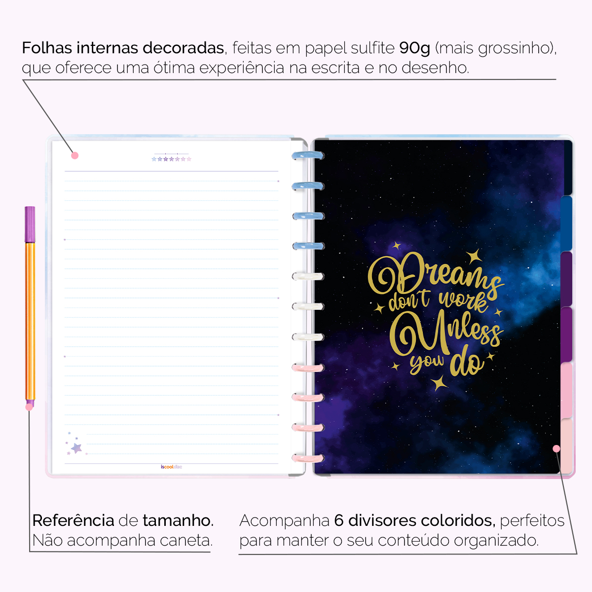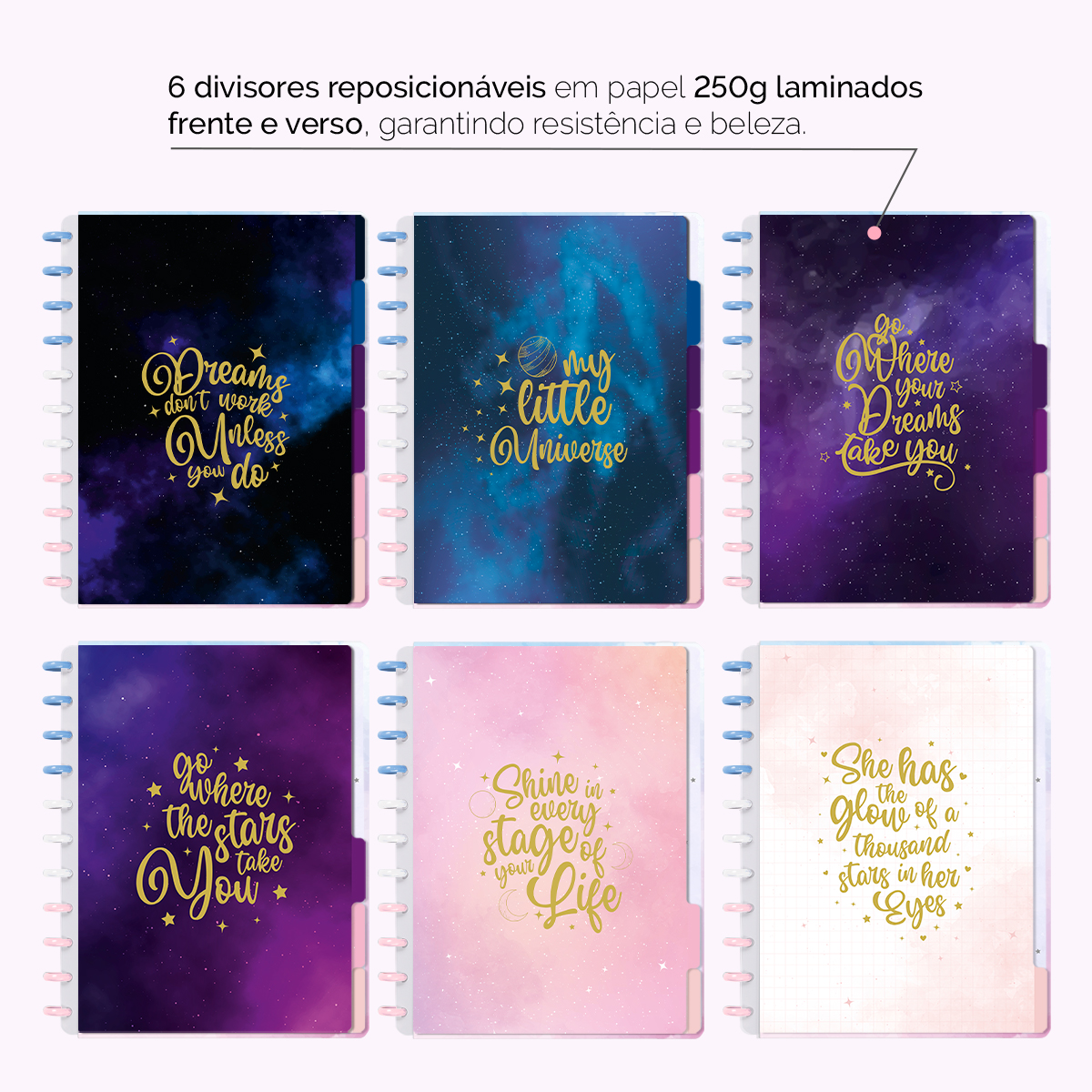A capa é dura com impressão digital de alta definição, acompanha 6 lindas divisórias que você pode colocar em qualquer local do caderno, funcionando como o guia perfeito para sua organização.