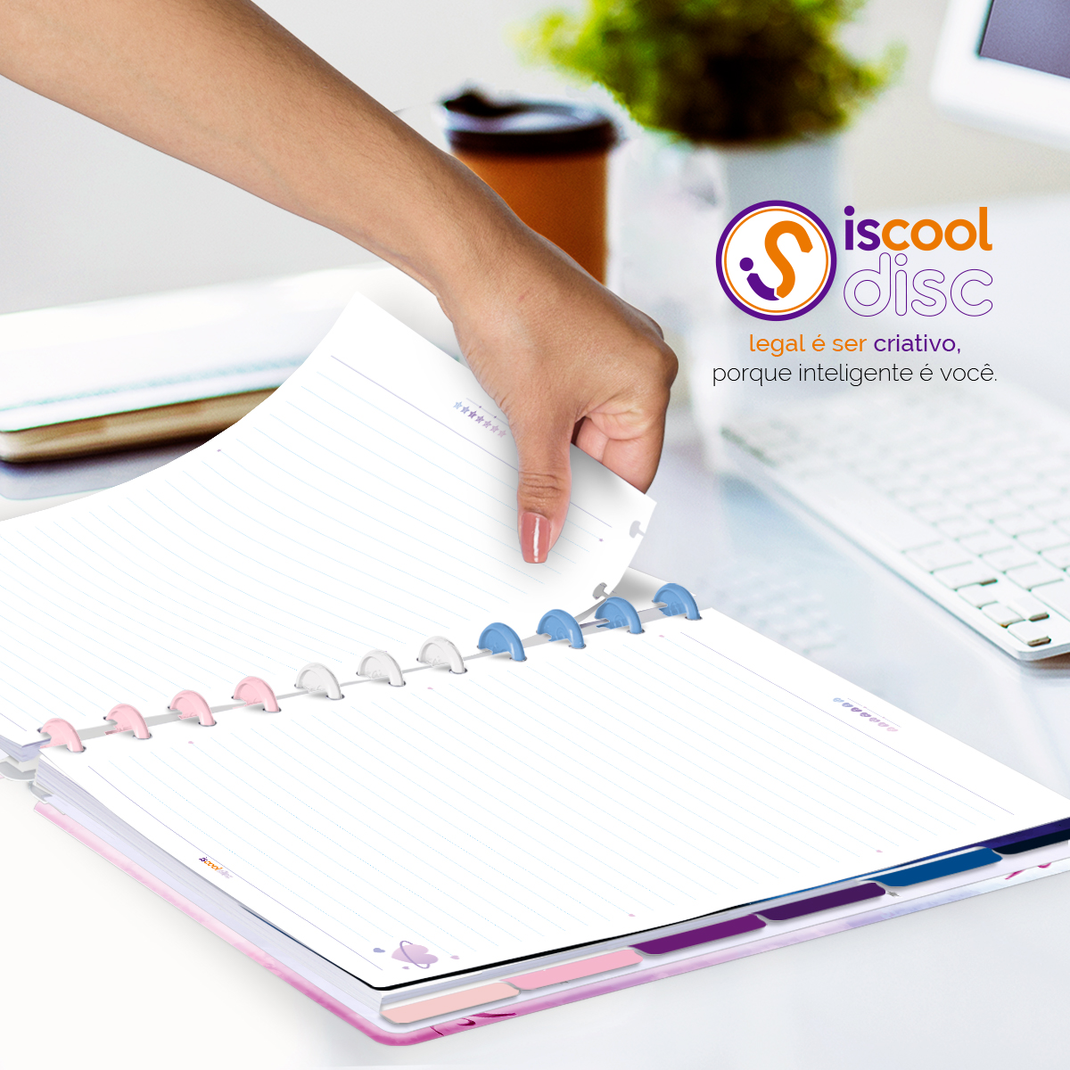 Com furos no formato de “cogumelo”, você poderá dar um “up” em seu caderno com nossos refis, além de ser compatível com outros fabricantes de cadernos de discos.